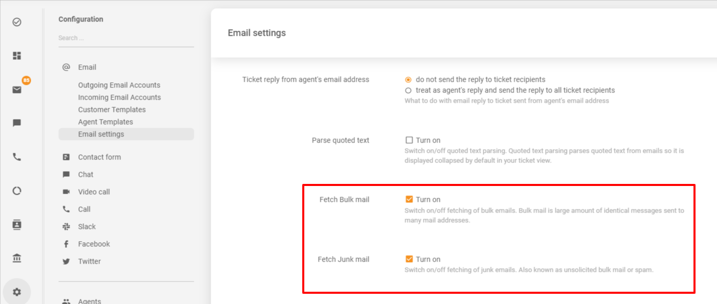 LiveAgentアカウントの「Configuration」(設定)> 「Email」(メール)> 「Email settings」(メール設定)に、特定のヘッダー(ヘッダー Precedence: junk または Precedence: bulk)を持つメールの取得に関する設定があります。