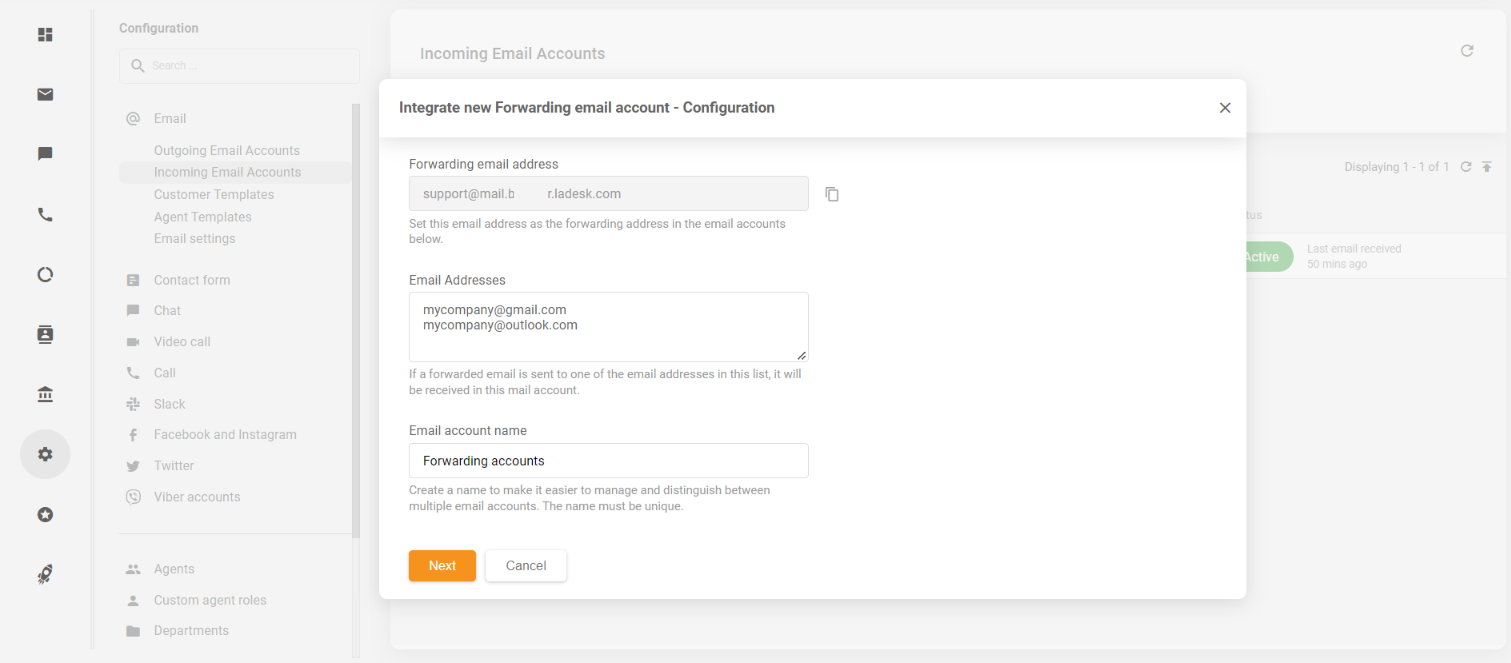 次の画面で、LiveAgentの組み込みメールアカウントに転送したいメールアドレスを入力します。転送を設定する複数のアドレスを入力することも可能です。他のメールアカウントと区別しやすいように名前を付け、**転送先メールアドレス(Forwarding email address)**をコピーしてください。このアドレスを、メールアカウントの設定にある転送機能に入力する必要があります。