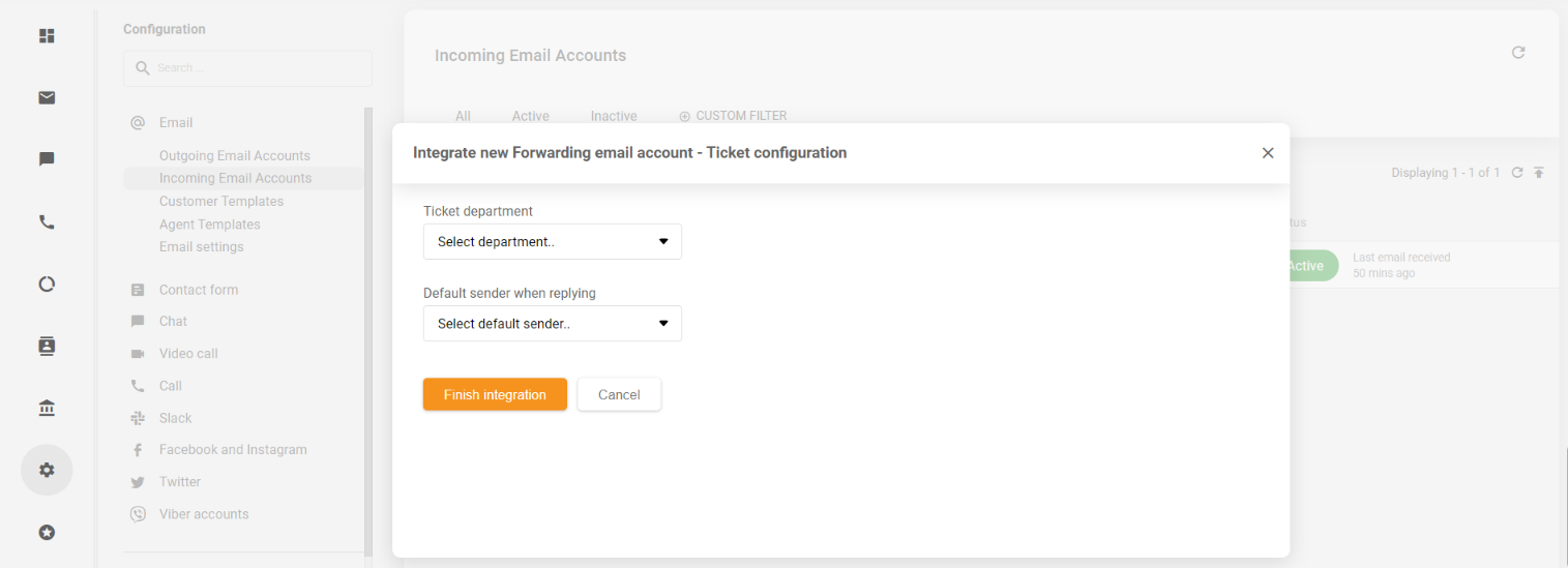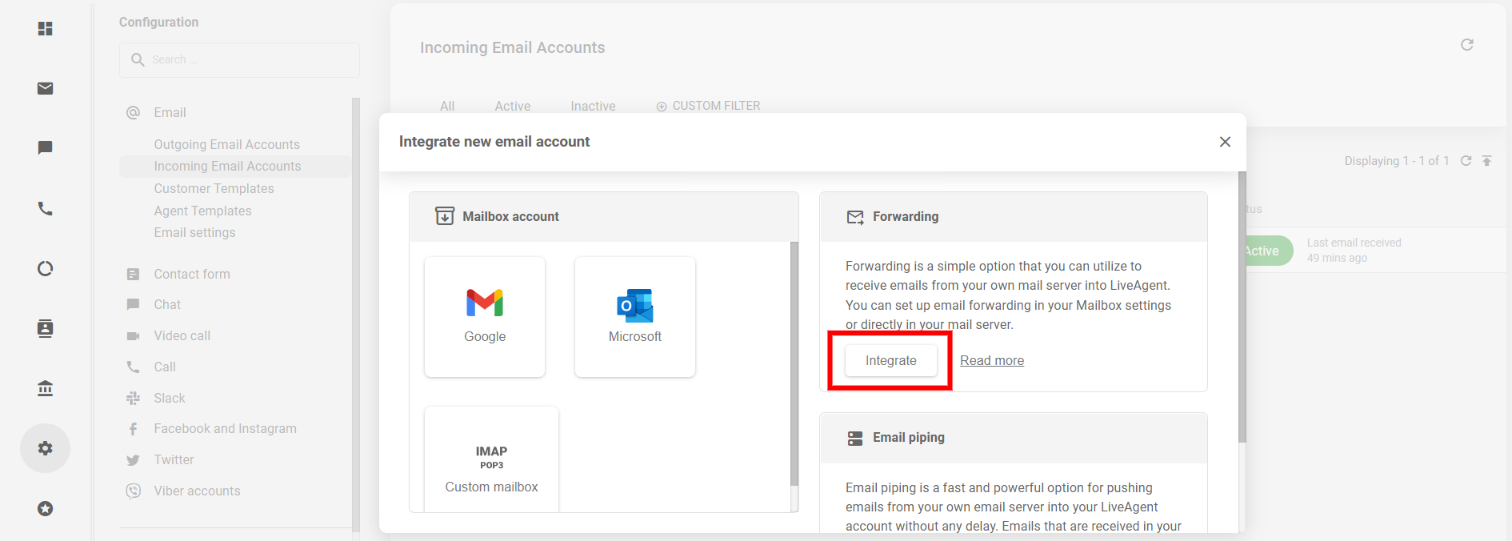 LiveAgentアカウントで、**Configuration(設定) > Email(メール) > Incoming Mail accounts(受信メールアカウント)に移動し、“Integrate new email account”(新しいメールアカウントを統合)**ボタンをクリックします。