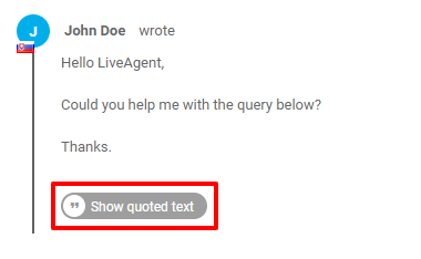 例えば、複数のメッセージがあるチケットで、メールが新しいメッセージと引用テキストに正しく分離されている場合、LiveAgentは各過去メールの新しいメッセージ部分(太字で強調)を引用テキストとして正しく追加できます。