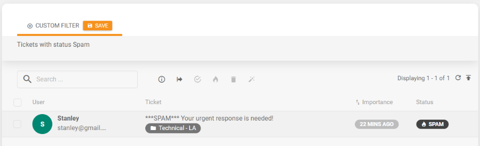 LiveAgentアカウントをお持ちで、組み込みメールを直接使用している場合、またはメールを転送して組み込みメールアカウントに受信している場合、受信したすべてのメールはクラウドサーバーにインストールされたSpamAssassinサービスによって自動的にチェックされます。メールがスパムと判定された場合、LiveAgentアカウントにスパムステータスとして取り込まれます。