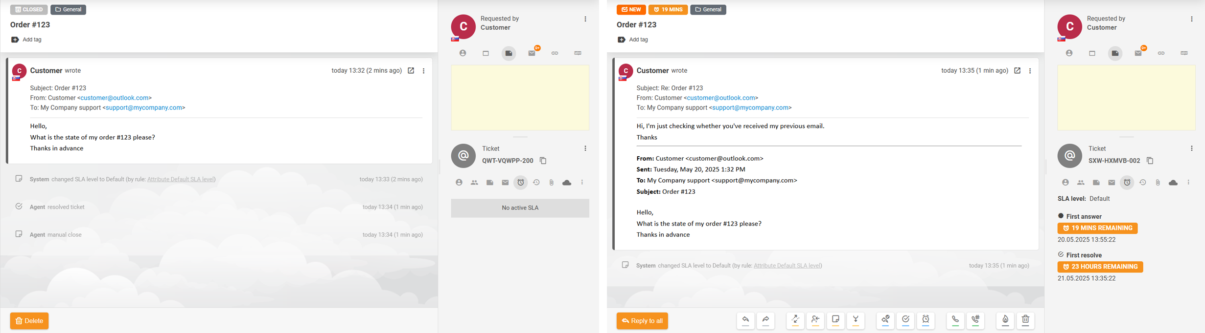 以下のスクリーンショットの例は、件名が異なる一見無関係な2通のメールが1つのチケットに統合された様子を示しています。ソースコードにアクセスしてヘッダーを確認すると、内容が異なるにもかかわらず、2通目のメールが実際には1通目への返信であることがわかります。これは、1通目のメールのMessage-ID値が、2通目のメールのIn-Reply-ToヘッダーとReferencesヘッダーに記載されているためです。