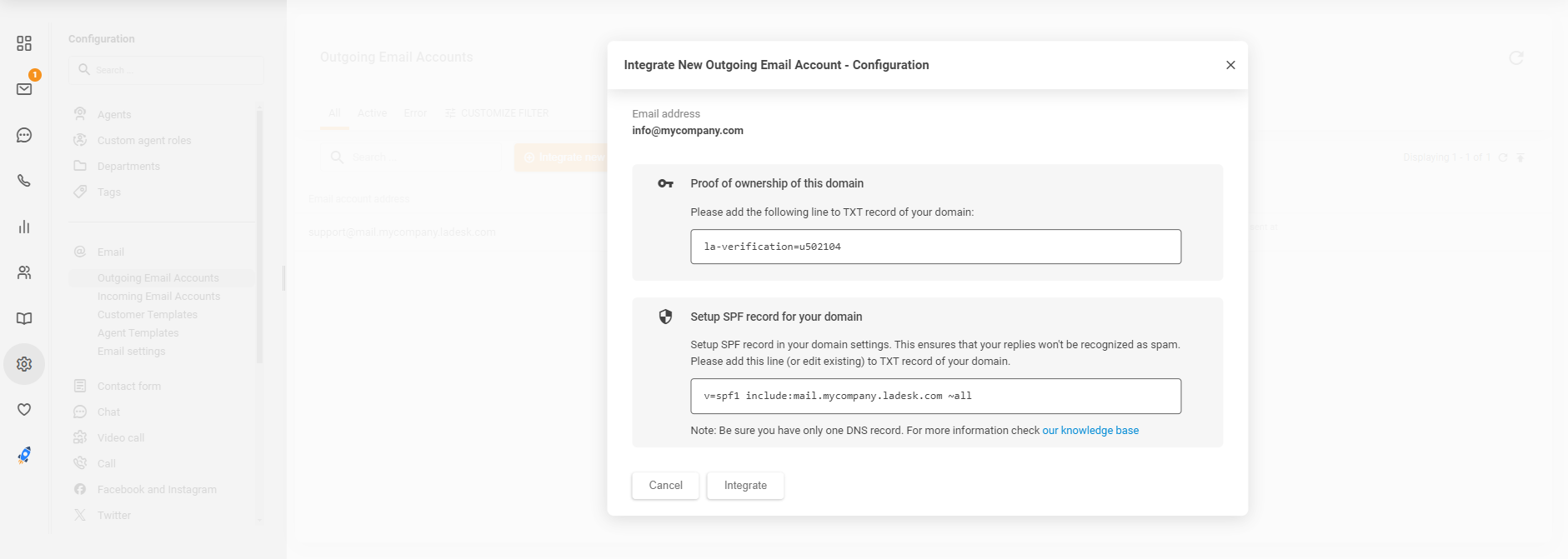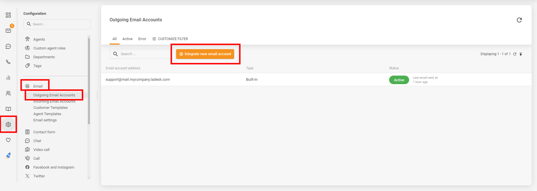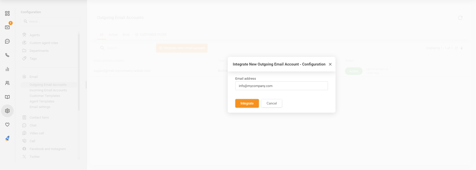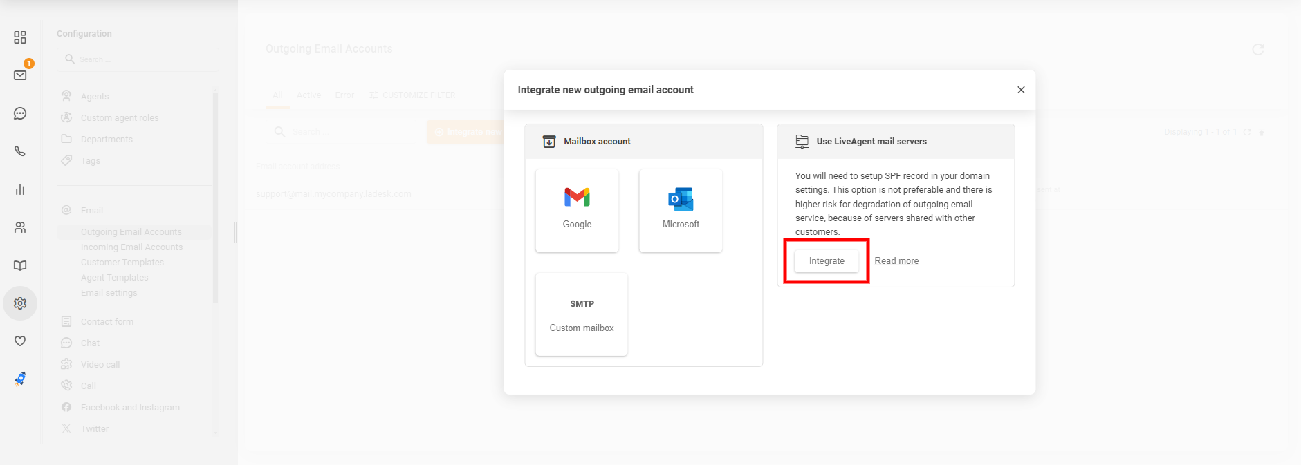 LiveAgentアカウントで、Configuration(設定) > Email(メール) > Outgoing Email Accounts(送信メールアカウント) に移動し、“Integrate new email account”(新しいメールアカウントを統合) ボタンをクリックします。