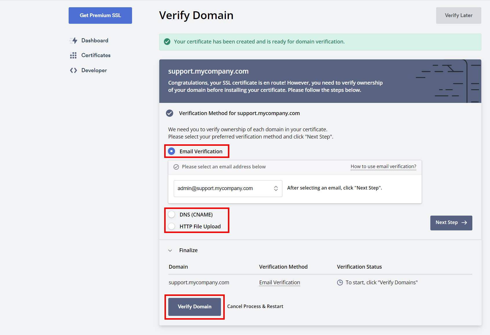 次のステップに進むと、ドメインの認証が求められます。 利用可能な認証方法は、メール認証(Email Verification)、DNS(CNAME)、HTTPファイルアップロード(HTTP File Upload)の3種類です。この中から任意の方法を選択できます。どの方法が最適かわからない場合は、サーバー管理者またはホスティングプロバイダーにご相談ください。