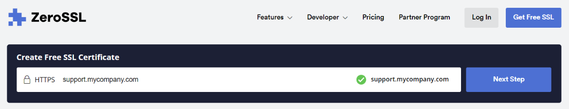 https://zerossl.com/ にアクセスし、選択したカスタムドメイン(例:support.mycompany.com)を上部の「Create Free SSL Certificate」フィールドに入力して、「Next step」をクリックしてください。