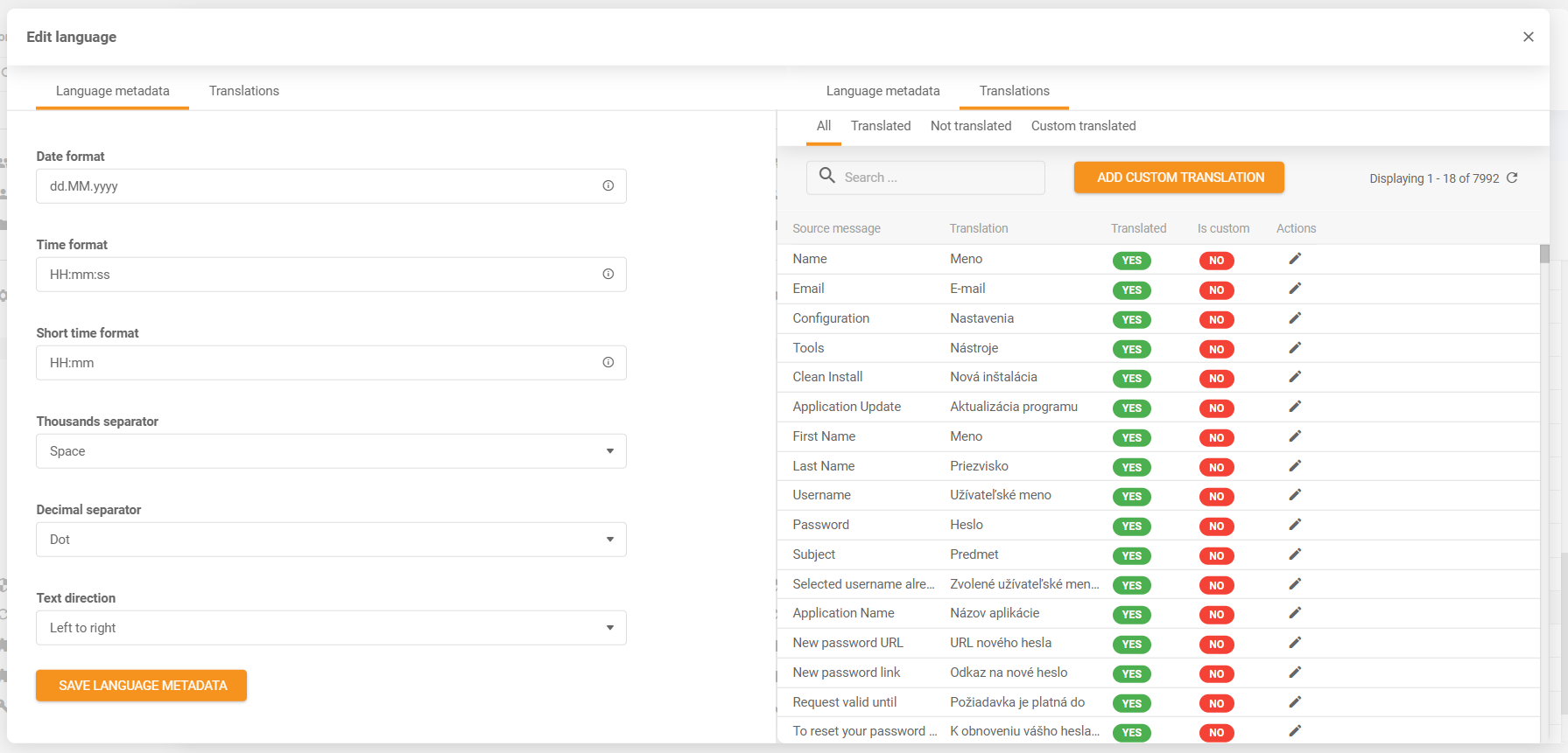 Actions(操作)列の"Edit"(編集)ボタン(鉛筆アイコン)をクリックすると、言語のメタデータと翻訳を編集できます。