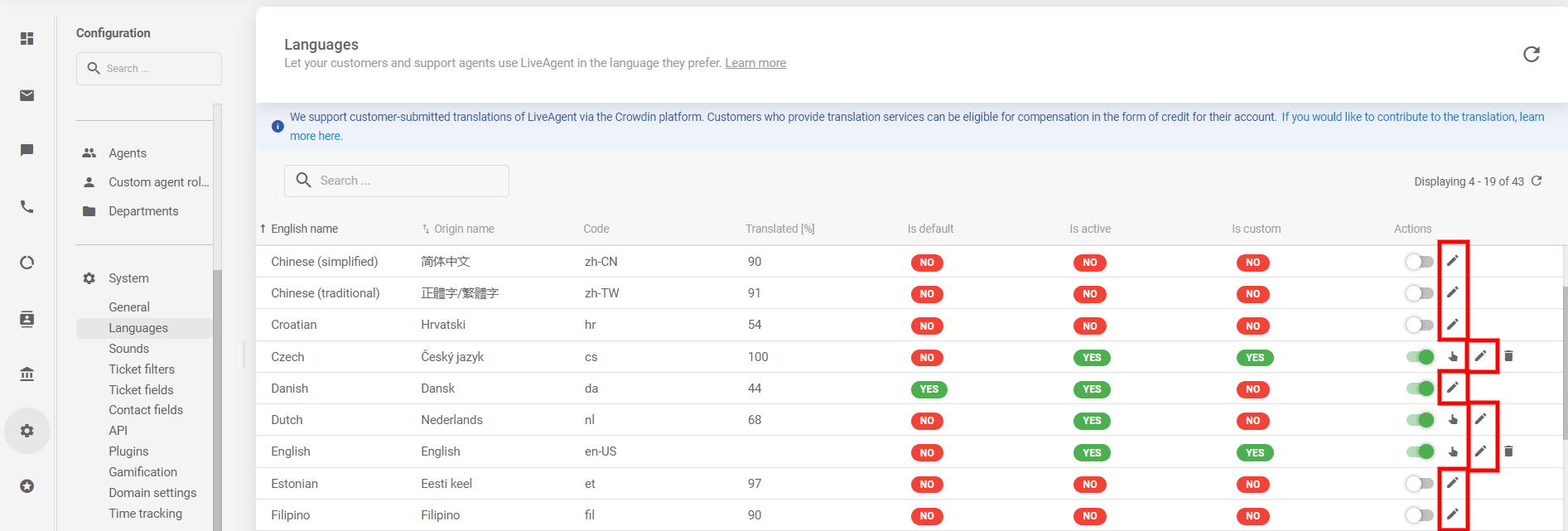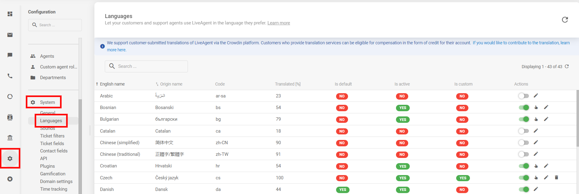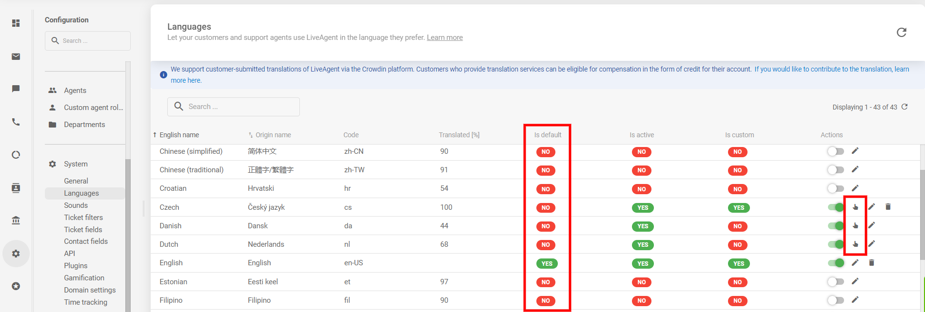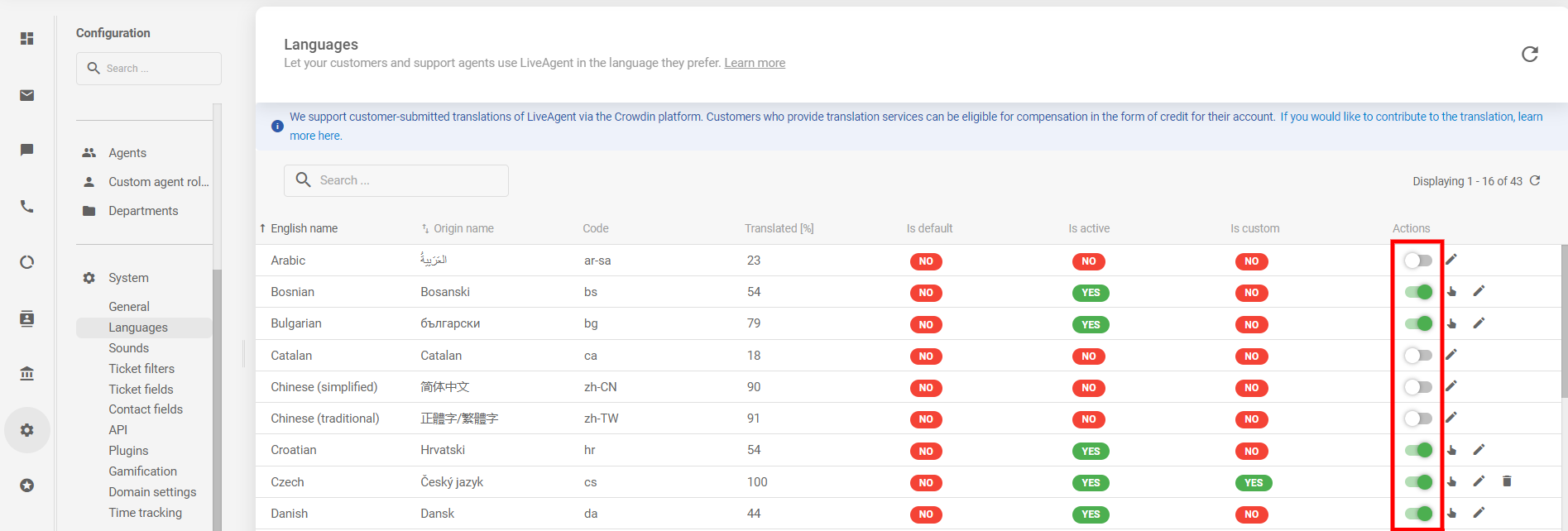 LiveAgentでは、パネルとカスタマーポータルで利用可能な言語を選択できます。言語を有効化または無効化するには、Actions(操作)列のトグルスイッチボタンをクリックしてください。