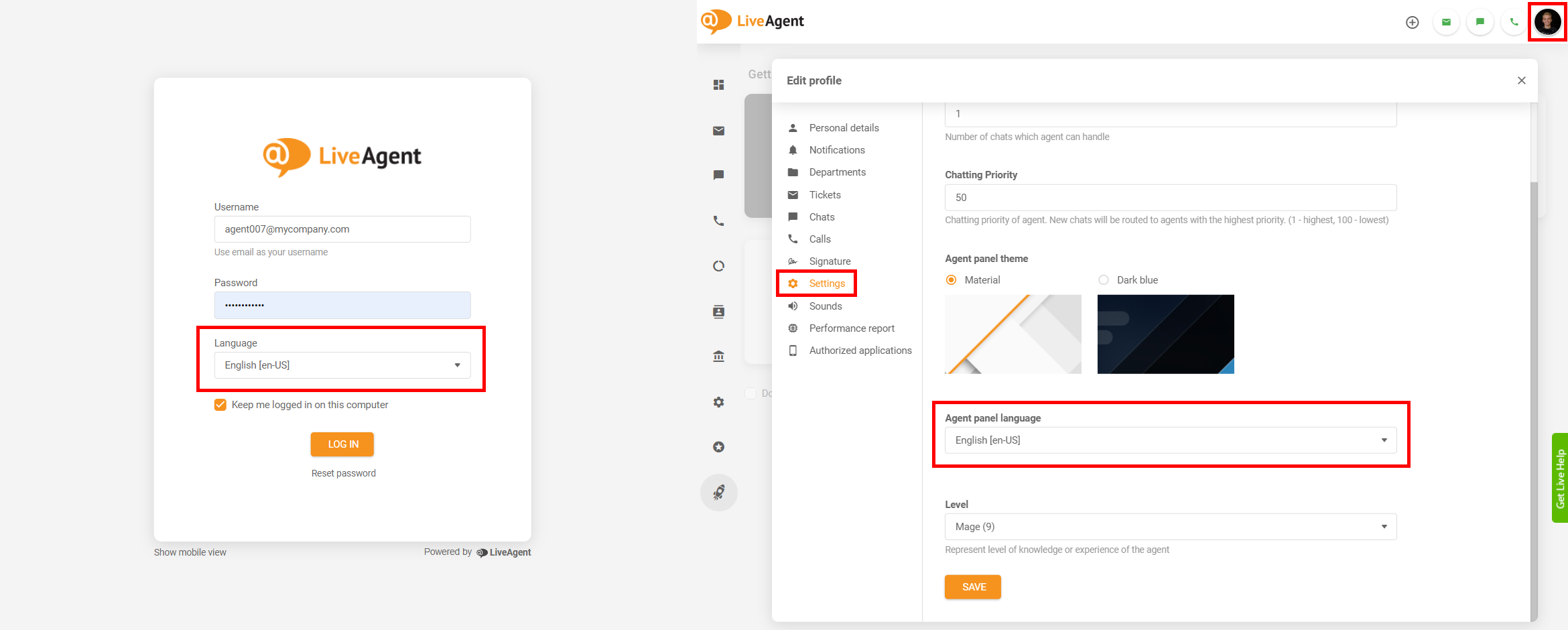 エージェントパネルの言語は、各エージェントがログイン画面で選択するか、プロフィールの設定セクションで変更することができます。 有効な言語が1つしかない場合、言語を選択するオプションは表示されません。