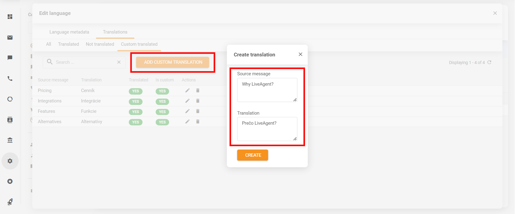 新しいカスタム翻訳を追加するには、翻訳リストの上にあるAdd custom translation(カスタム翻訳を追加)ボタンをクリックします。Source message(ソースメッセージ)とその翻訳(Translation)の両方を定義します。Create(作成)をクリックすると、新しい翻訳が言語翻訳に追加されます。