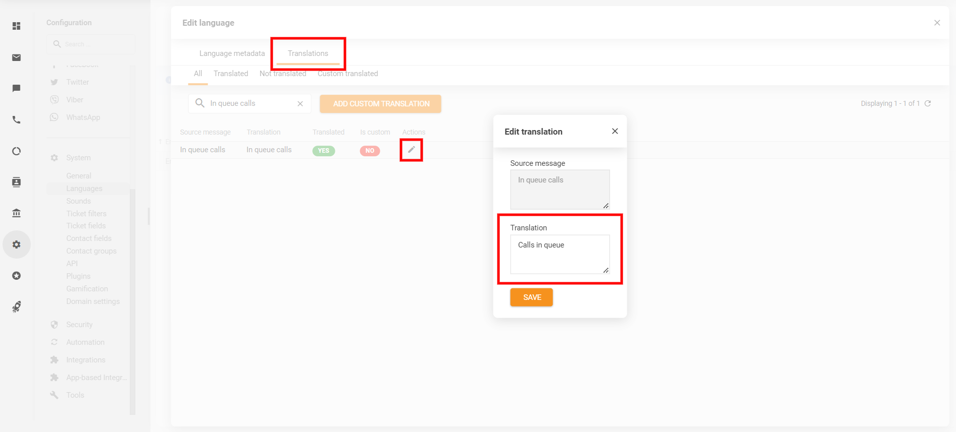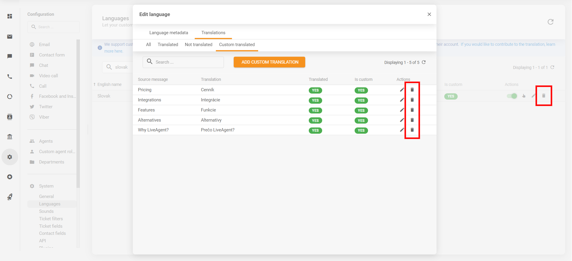 LiveAgentでは、各言語の翻訳をカスタマイズしたり、ウィジェットやカスタマーポータルで使用する新しいカスタム翻訳を作成したりすることができます。言語翻訳を変更または作成するには、Configuration(設定) > Languages(言語)に移動し、Actions(アクション)列にあるEdit(編集)ボタン(鉛筆アイコン)をクリックして編集したい言語を選択し、Translations(翻訳)タブに移動します。