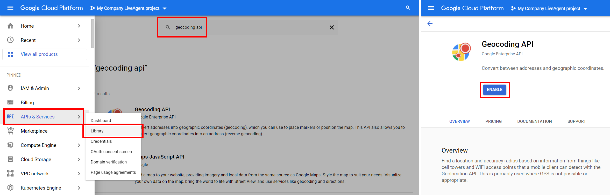 顧客の連絡先詳細画面にGoogleマップを表示したい場合は、Geocoding APIの有効化も必要です。APIs & Services > Libraryに移動し、検索して有効化してください。新たにAPIキーを作成する必要はありません。Maps JavaScript APIとGeocoding APIはデフォルトで同時に使用されます。