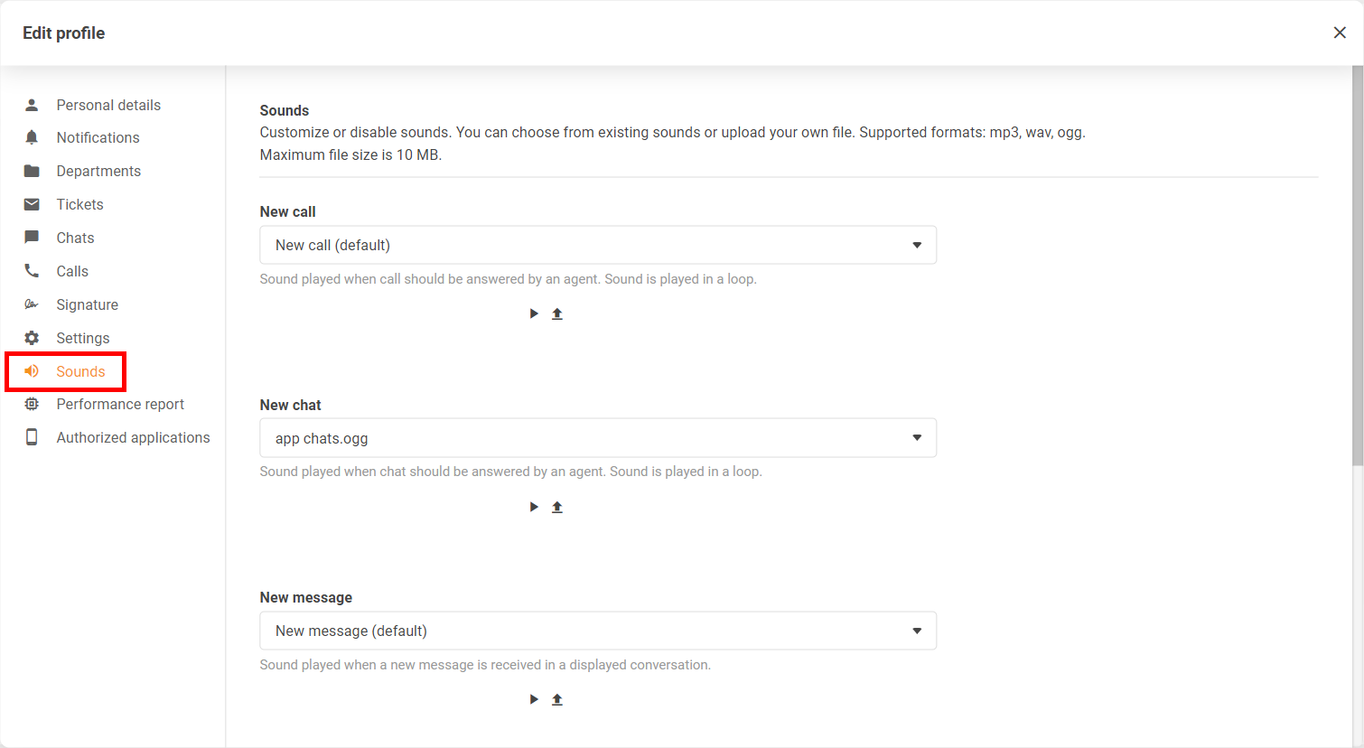 各エージェントは、自分のプロフィールのSounds(サウンド)セクションで個別にサウンドを設定することもでき、この設定はデフォルトのサウンドより優先されます。