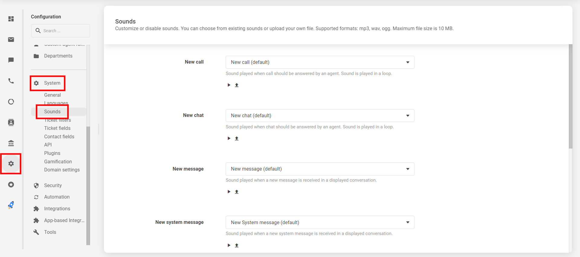 全エージェントのデフォルトサウンドの設定は、Configuration(設定)> System(システム)> Sounds(サウンド)で行えます。 Play(再生)ボタンをクリックして現在のサウンドをテストするか、ドロップダウンメニューから新しいサウンドを選択してください。リストボックス内の選択肢にカーソルを合わせると、そのサウンドが再生されます。カスタムサウンドを追加するには、Upload(アップロード)ボタン(下線付き矢印アイコン)をクリックしてください。セクション下部の設定を忘れずに保存してください。