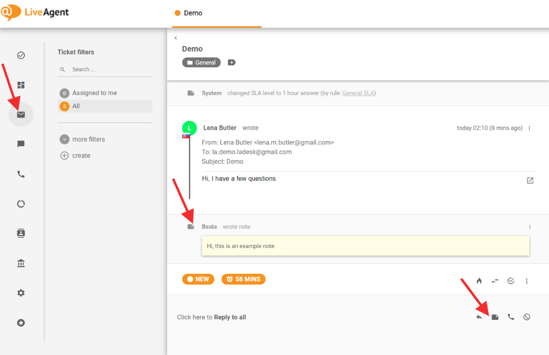 LiveAgentでは、任意のチケットにプライベートなメモを追加することができます。このメモはエージェントにのみ表示され、チケットの依頼者やCCに追加された他のエンドユーザーには見えません。
