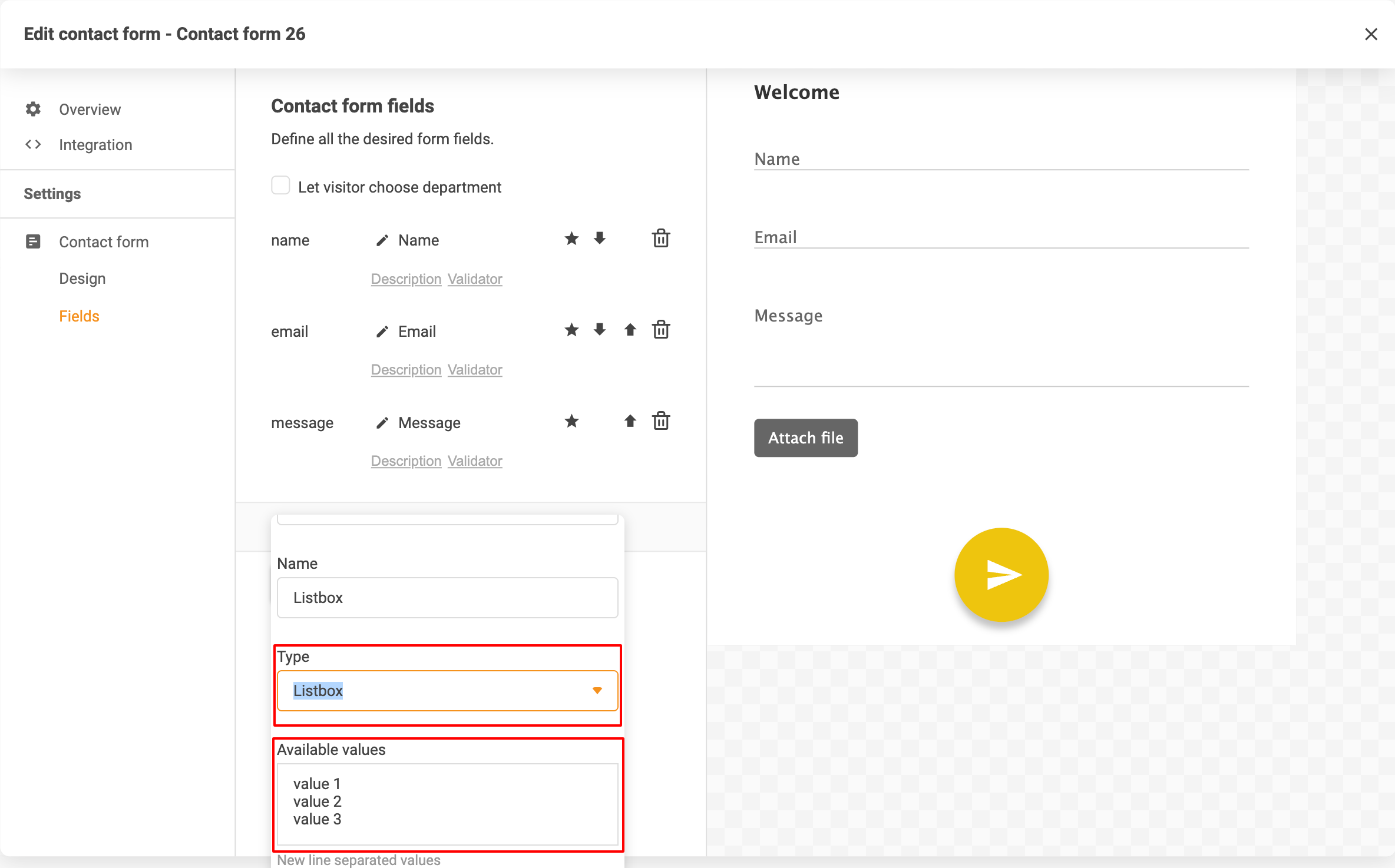 2. 「Edit contact form」(お問い合わせフォームの編集)セクションで、Contact form(お問い合わせフォーム)> Fields(フィールド)> ‘Add field’(フィールドを追加)をクリック > Create field(フィールドを作成)に移動します。新しいリストボックスフィールドの名前とラベルを設定してください。