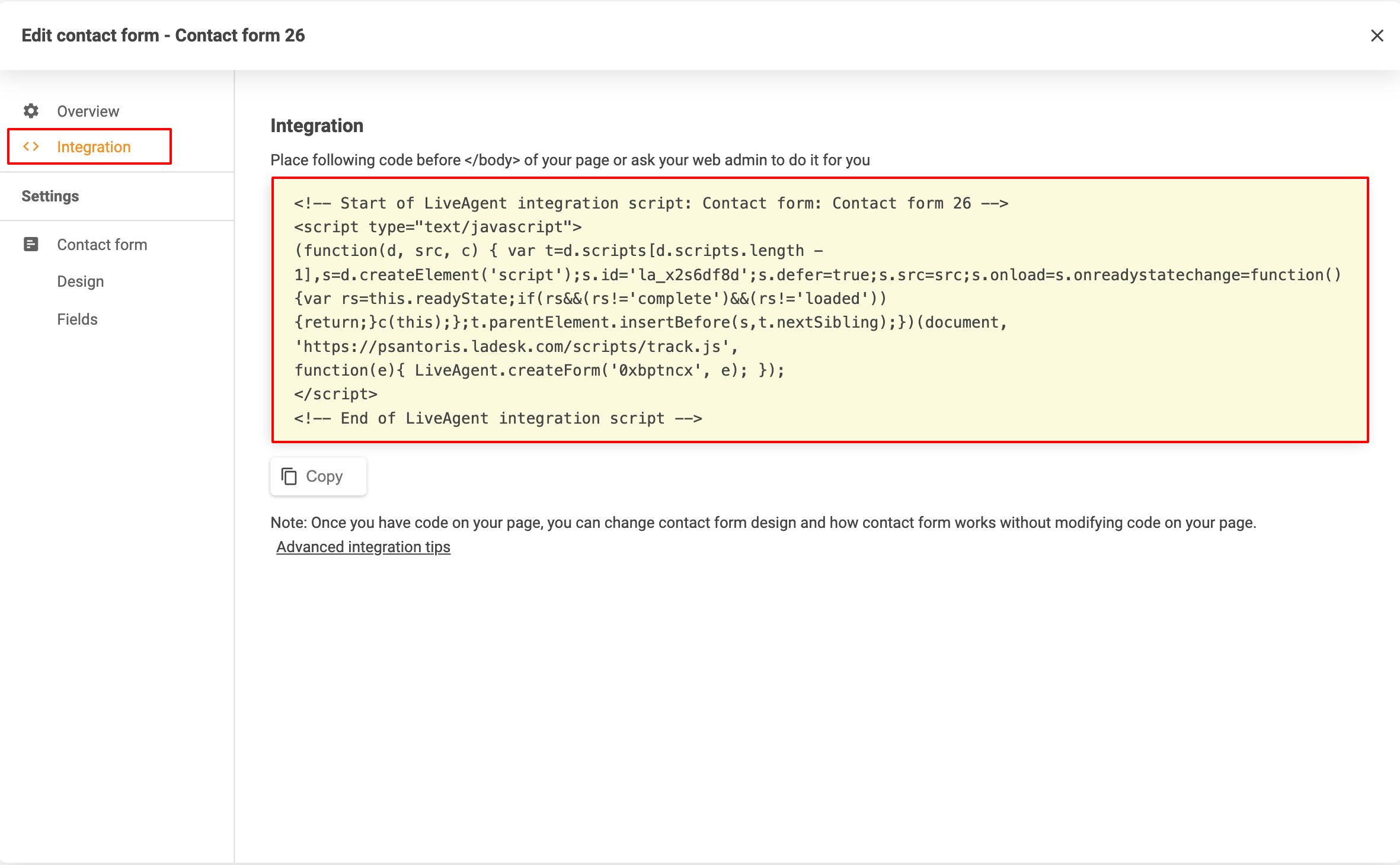 5. 「Integration」(統合)セクションに移動し、お問い合わせフォームの統合コードをコピーします。