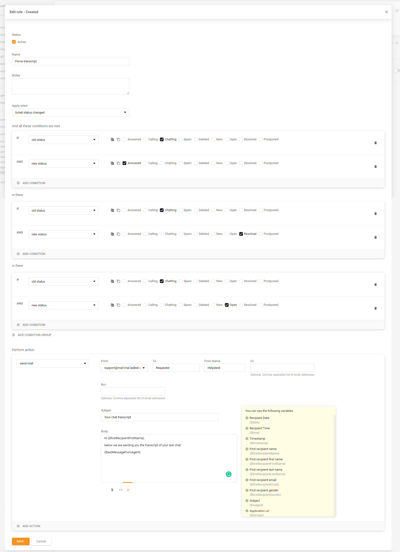 訪問者がトランスクリプトを受け取るかどうかを自分で決定できる場合でも、自動化ルールを使用してトランスクリプトの送信を強制することができます。ルールはConfiguration(設定)> Automation(自動化)> Rules(ルール)から作成できます。以下は、チャット終了後のチケットの状態に関わらず、トランスクリプトを送信するルールの例です。