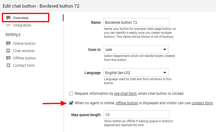 ‘Overview’(概要)セクションで、以下のスクリーンショットに示すように「When no agent is online, offline button is displayed and visitor can use contact form.」(エージェントがオンラインでない場合、オフラインボタンが表示され、訪問者はお問い合わせフォームを使用できます。)のオプションのチェックを外してください: