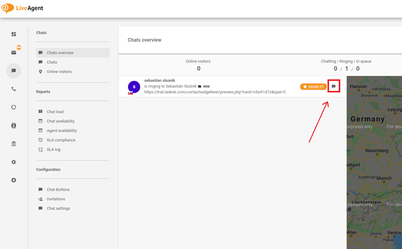 顧客をキューで待たせたくない場合は、現在対応中のチャット数やチャット/コールの対応可否状態に関わらず、キューインジケーターをクリックすることでチャット/コールに応答することができます。また、Chats(チャット) –> Chat overview(チャット概要)セクションから直接チャットを選択することも可能です。