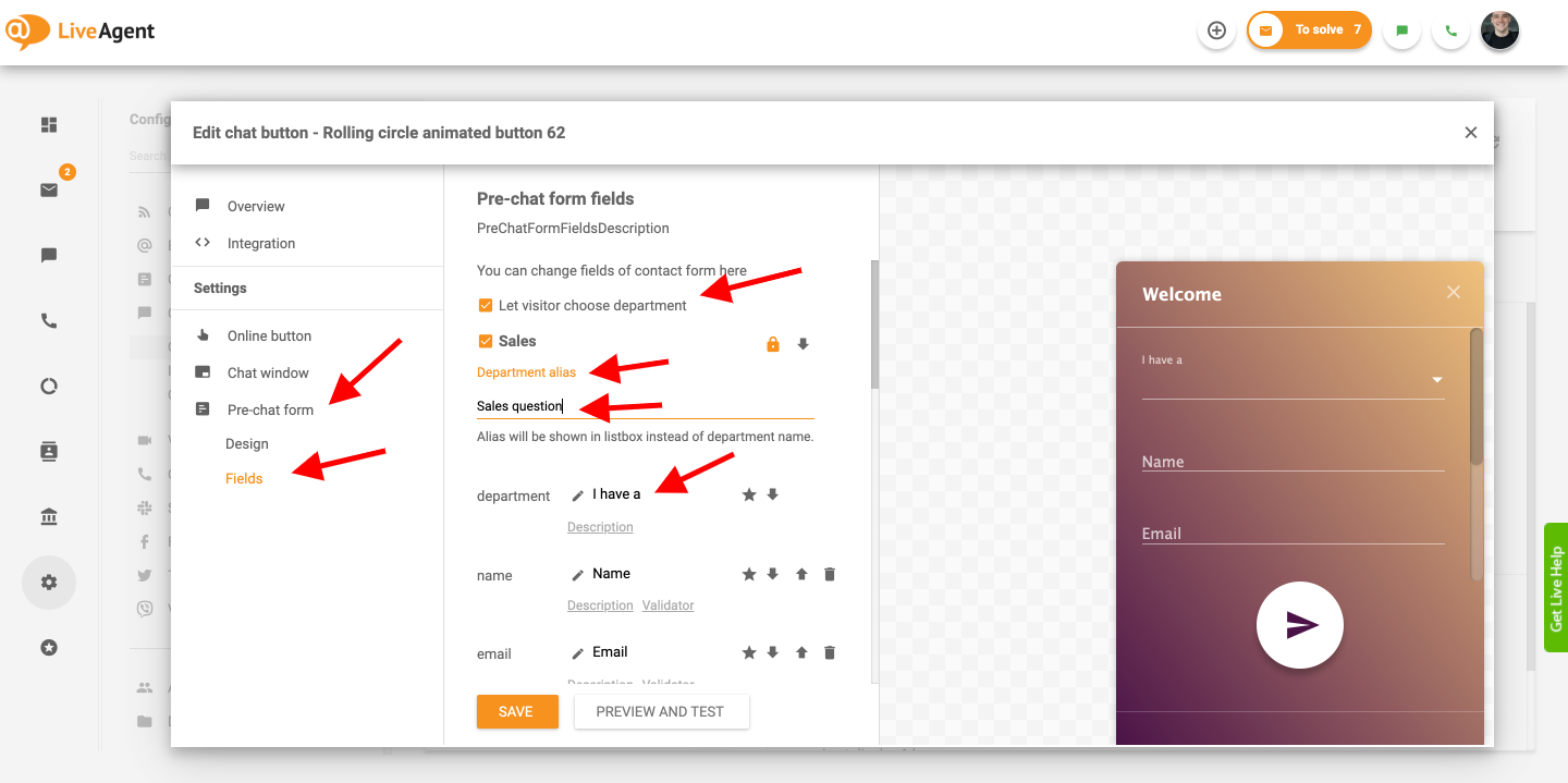 次に、Pre-chat form(プレチャットフォーム)> Fields(フィールド)に移動し、「Let visitor choose department」(訪問者が部門を選択できるようにする)を選択します。その後、訪問者に選択させたい部門を選び、「Department alias」(部門の表示名)を編集します。この例では「Sales question」(営業に関する質問)となっています。さらに、鉛筆アイコンをクリックして部門を編集します。この例では「I have a」(お問い合わせの種類)と設定しています。設定が完了したらボタンを保存すると、選択した部門の中からお客様が選べるようになります。