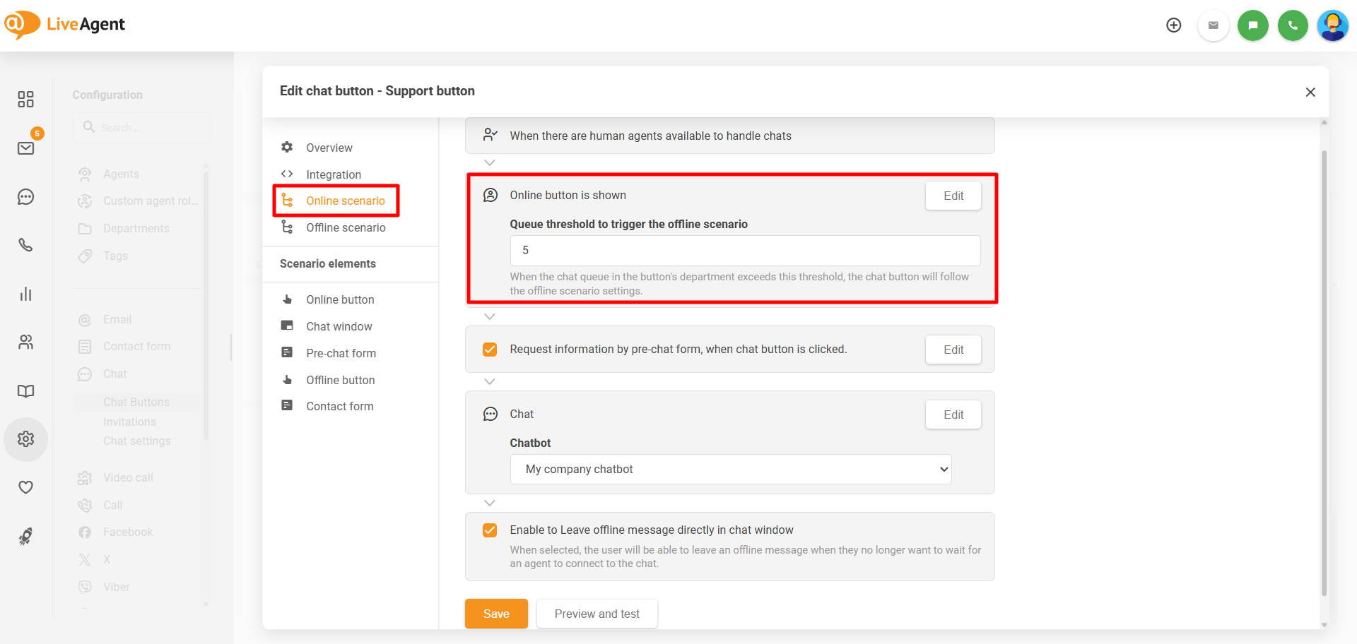 キュー閾値は、チャットボタンの設定にあるオンラインシナリオセクションで設定できます。「Configuration」(設定)> 「Chat」(チャット)> 「Chat buttons」(チャットボタン)に移動し、編集したいボタンをクリックして、「Online scenario」(オンラインシナリオ)に進みます。 キュー閾値はボタンごとに個別に設定でき、1〜100の値を指定できます。