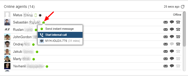 Livegentでは、同僚のエージェントへの内線通話を簡単に行うことができます。エージェントパネルのダッシュボードから、エージェント名の横にある緑色のドットをクリックすることで発信できます。
