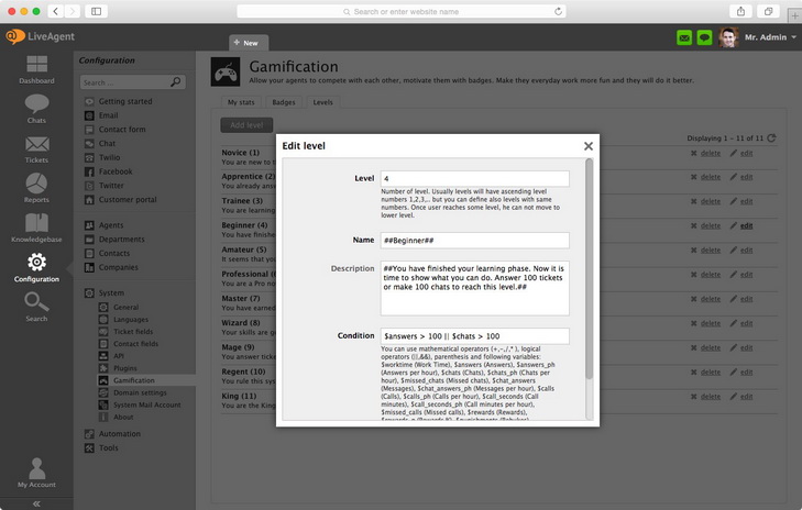 例: エージェントが500件以上のチケットに回答すると、「プロフェッショナルレベル」を達成し、ステータスに表示されます。モチベーションメッセージは次のとおりです:「あなたは今やプロです。あなたの回答は的確で要点を押さえています。お客様はあなたの回答を心待ちにしています。このレベルに到達するには、500件のチケットに回答するか、500回のチャットを行ってください。」