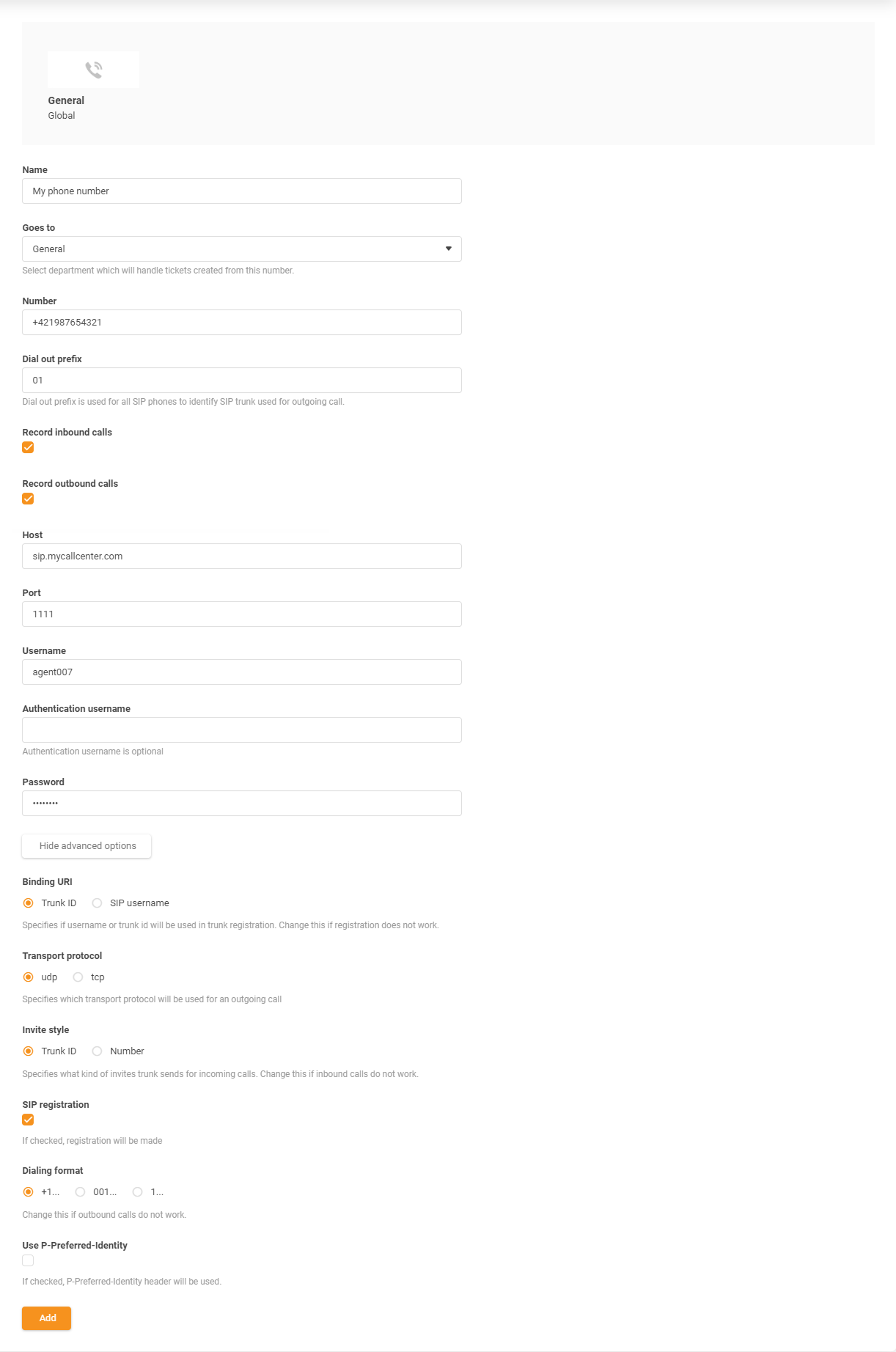 LiveAgentは、さまざまなVoIPプロバイダー向けのプリセット接続プロファイルを多数用意しており、接続プロセスをシンプルかつ簡単に保っています。特定のプロバイダーのコネクターを選択し、必要な情報を入力するだけで電話番号を接続できます。必要な情報はご利用のVoIPプロバイダーから提供されます。番号を追加した後、登録が完了するまでしばらく時間がかかる場合があります。登録完了後、発信・着信の両方が可能になります。