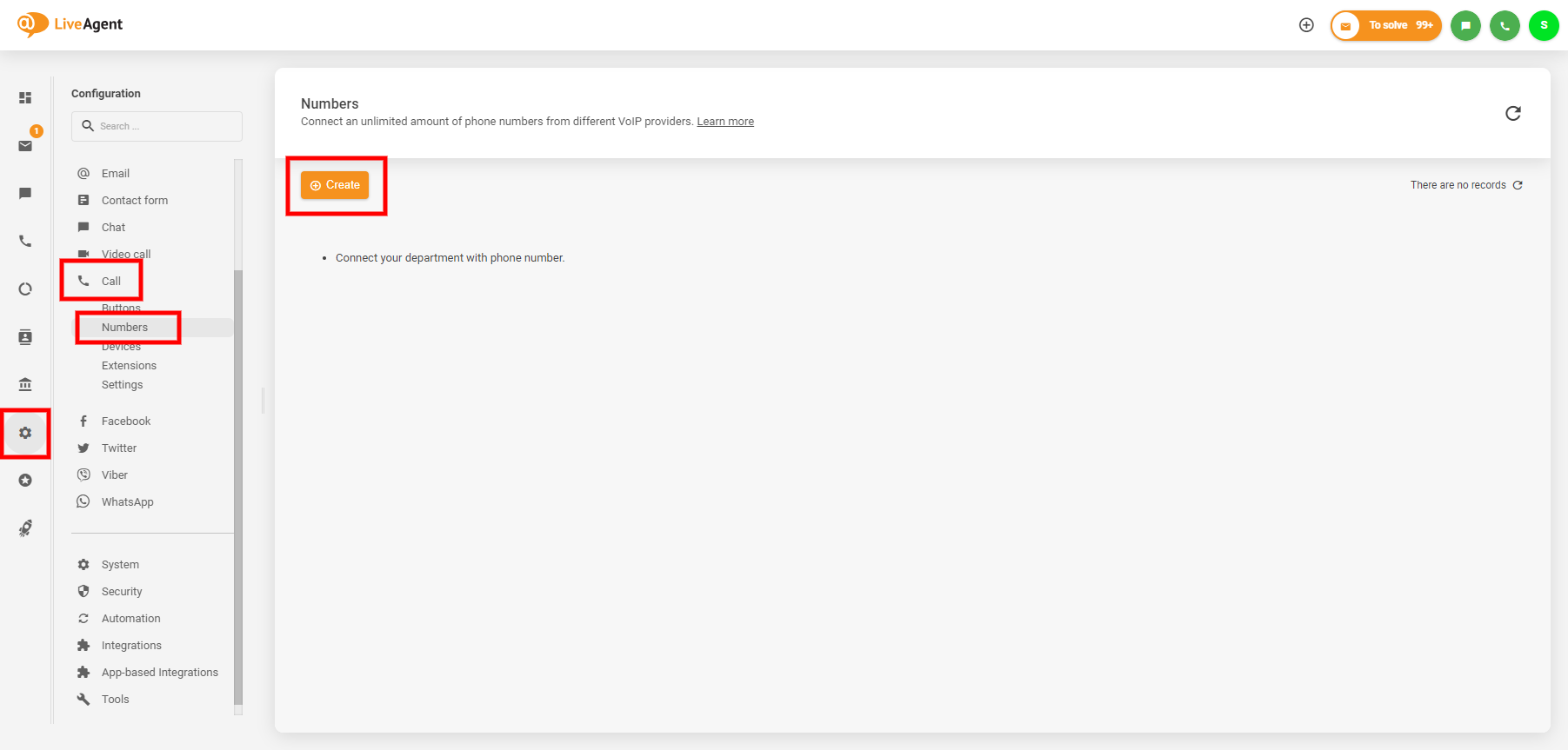 LiveAgentアカウントに新しい電話番号を追加するには、Configuration(設定)> Call(通話)> Numbers(番号)に移動し、“Create”(作成)ボタンをクリックします。 このセクションにアクセスできるのは、管理者またはオーナーロールのユーザーのみです。