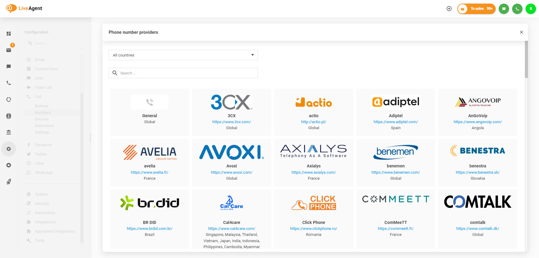 LiveAgentは、電話の受信・応答・録音・チケットへの記録ができるコールセンターソリューションを提供しています。LiveAgentのコールセンター機能は、SIPトランクをサポートするVoIP(Voice Over Internet Protocol)プロバイダーの電話番号を接続することで動作します。電話番号はご利用のVoIPプロバイダーからご購入いただく必要があります。LiveAgentは電話番号の提供・販売は行っておりません。 SIPトランクに対応していない通常の電話番号は統合できません。