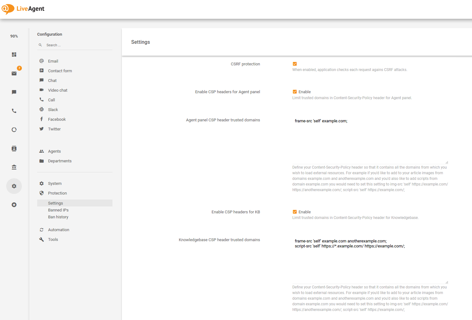 コンテンツセキュリティポリシー(CSP)ヘッダーを定義することで、LiveAgentエージェントパネルやナレッジベースを標的としたクロスサイトスクリプティング(XSS)、クリックジャッキング、およびその他のコードインジェクション攻撃を防ぐことができます。