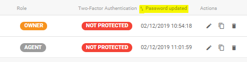 Configuration(設定) > Agents(エージェント) セクションでは、エージェントが2要素認証を設定しているかどうかと、「password updated」(パスワード更新日時)の列でパスワードがいつ更新されたかを確認することもできます。現時点では、特定のエージェントのパスワードを手動で失効させたり、すべてのエージェントに2要素認証の設定を強制したりすることはできません。