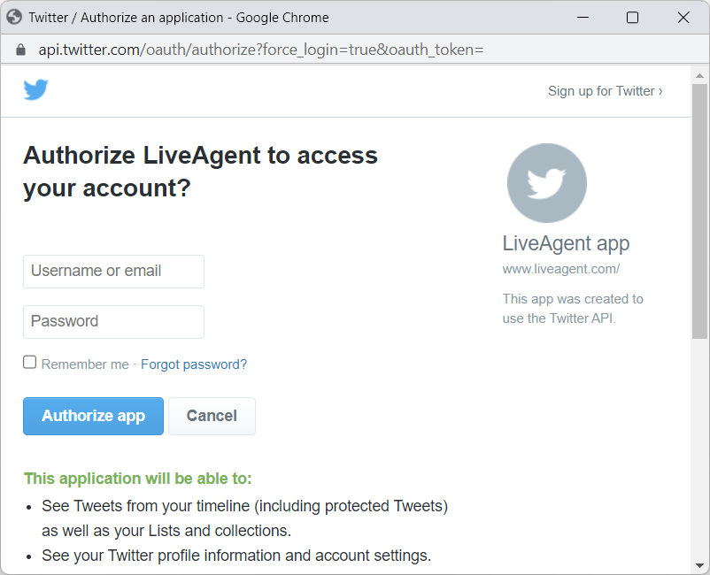 これでTwitterアカウントがLiveAgentアカウントに接続され、LiveAgentのパネルから直接新しいツイートを作成できるようになります。