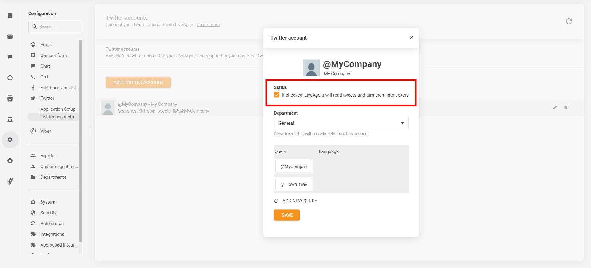 ツイートやコメントの取得および返信を行うには、Edit(編集)ボタン(鉛筆アイコン)をクリックし、“If checked, LiveAgent will read tweets and turn them into tickets”(チェックを入れると、LiveAgentがツイートを読み取りチケットに変換します)オプションを有効にしてください。
