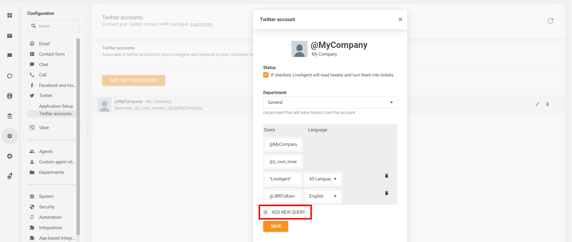 自分自身のツイートやアカウントへのメンションに加え、追跡したいツイートの条件を独自に設定することも可能です。“Add new query”(新しいクエリを追加)をクリックすることで、どのツイートをチケットに変換するかをカスタマイズできます。