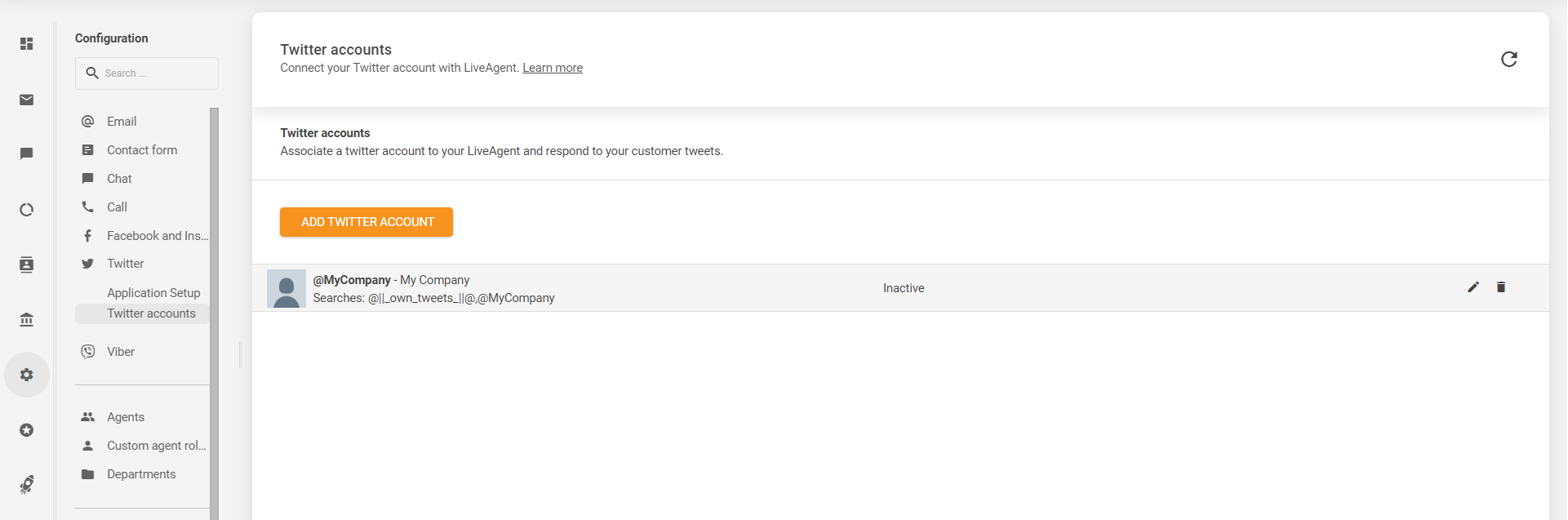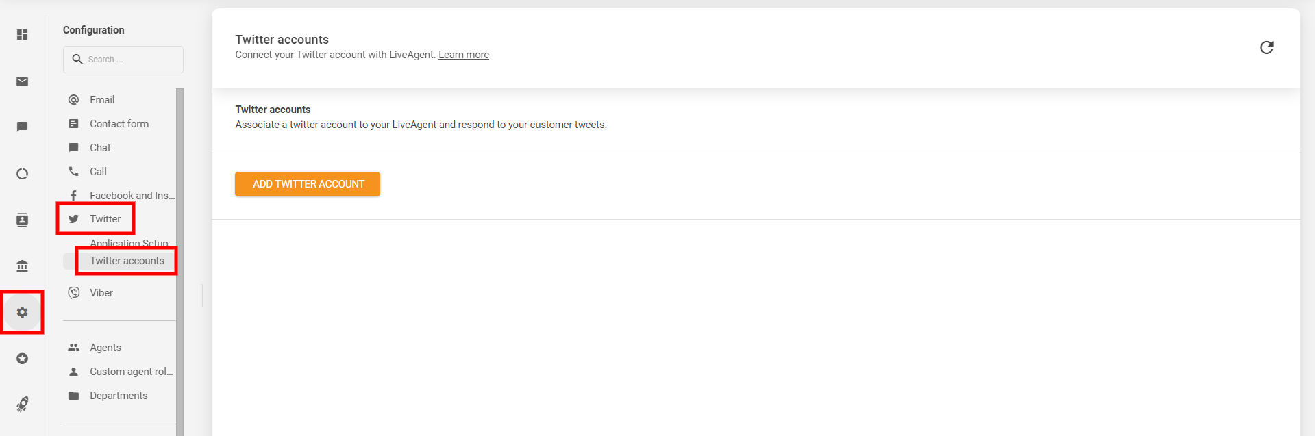 Twitterアプリの設定が完了したら、連携を開始するためにLiveAgentアカウントで Configuration(設定)> Twitter > Twitter accounts(Twitterアカウント)に移動し、“Add Twitter account”(Twitterアカウントを追加)を選択してください。