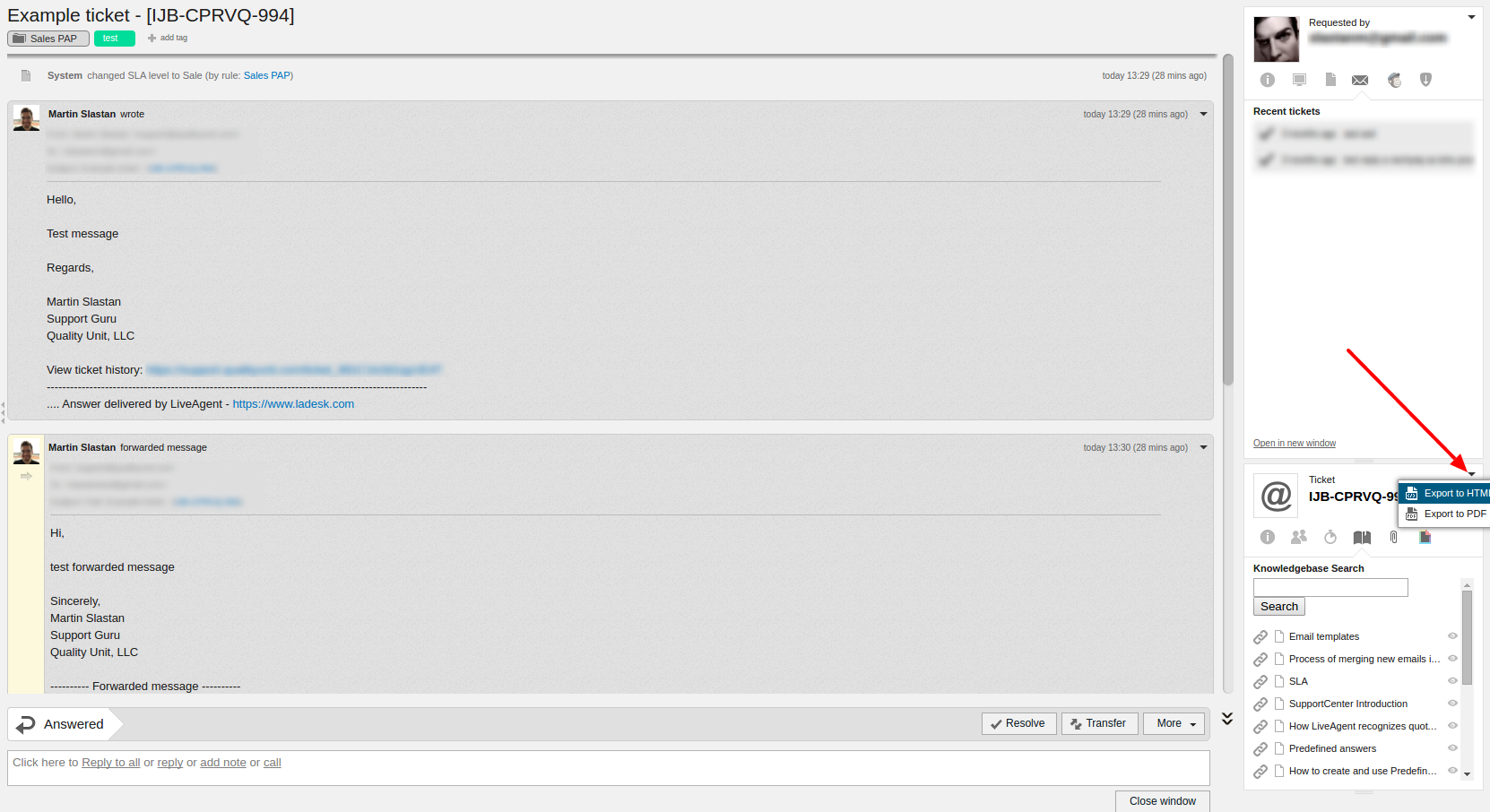 チケットをエクスポートするには、右側のチケットメニューにあるチケットIDの隣の小さな矢印をクリックしてください。そこに Export to HTML(HTMLとしてエクスポート)と Export to PDF(PDFとしてエクスポート)の2つのオプションが表示されます。