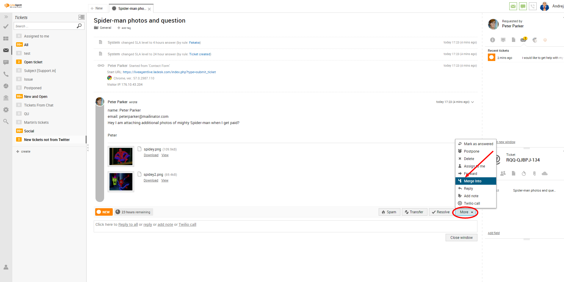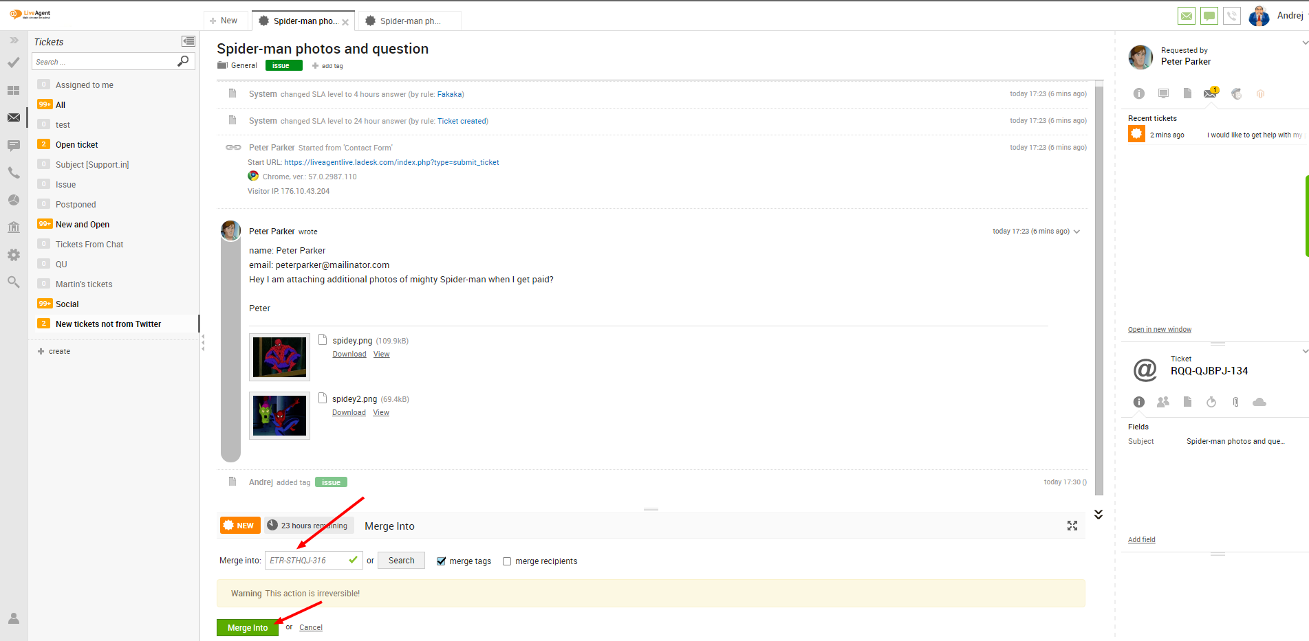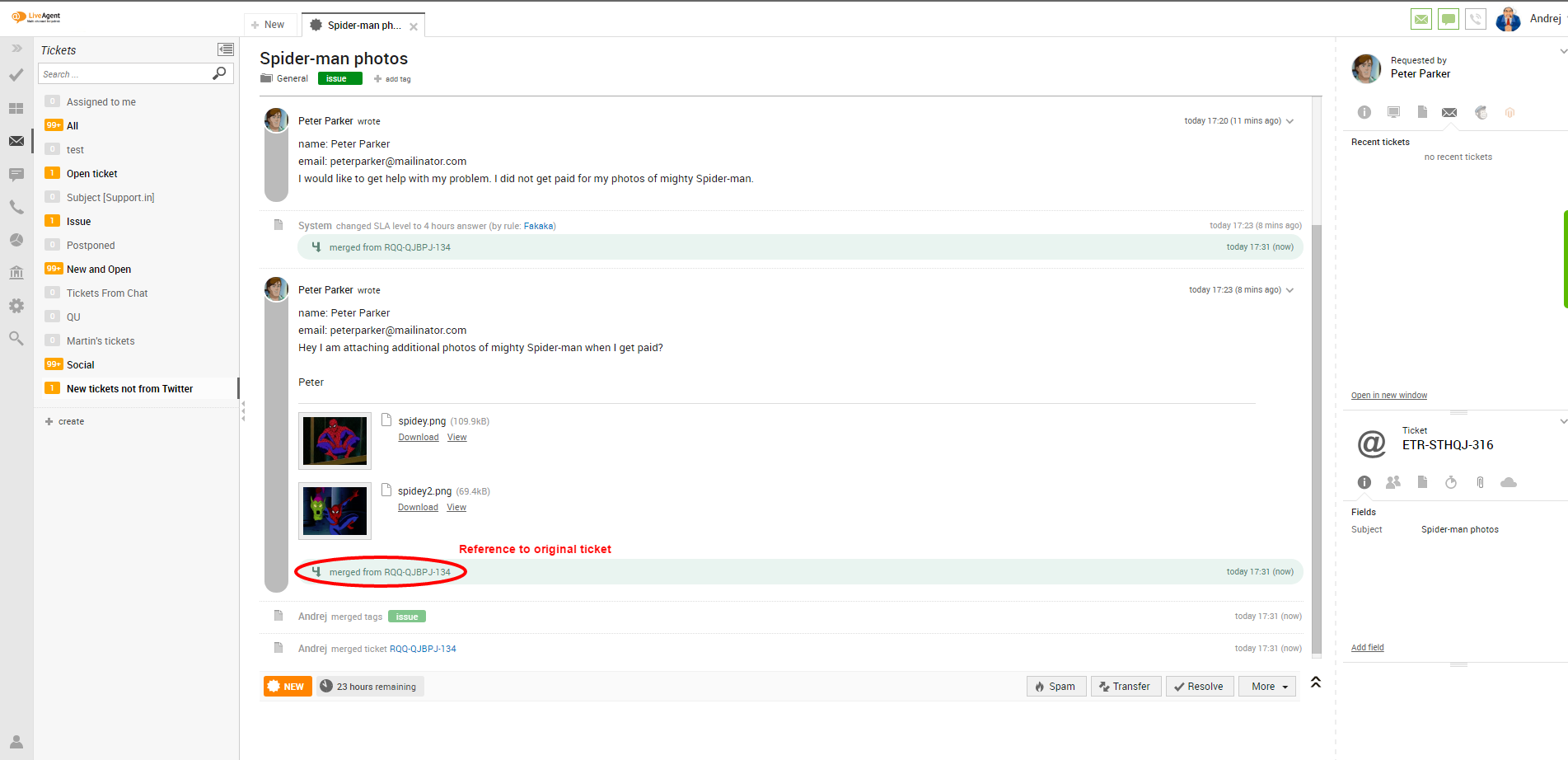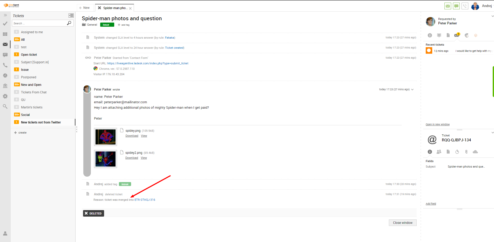 - チケットの統合を確定すると、LiveAgentは統合されたチケットを自動的に削除し、そのメッセージを統合先のチケットに追加します(この例では ETR-STHQJ-316 に追加され、統合されたタグ issue も確認できます)。また、元のチケットへの参照もここで確認できます。新たに統合されたチケットのステータスは、統合前と同じ状態が維持されます。