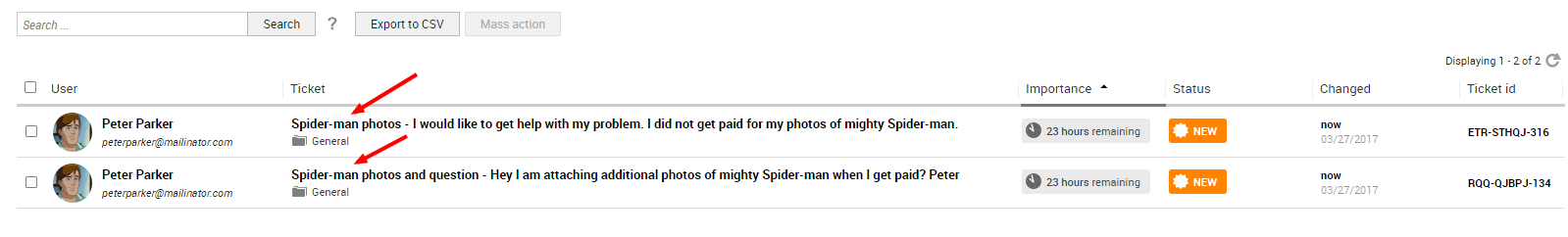 以下の2つのチケットは、同じ依頼者であるPeterからLiveAgentに届いたものです。どちらも同じトピックに関するものですが、それぞれ異なるデータが含まれています。これらを統合してみましょう。