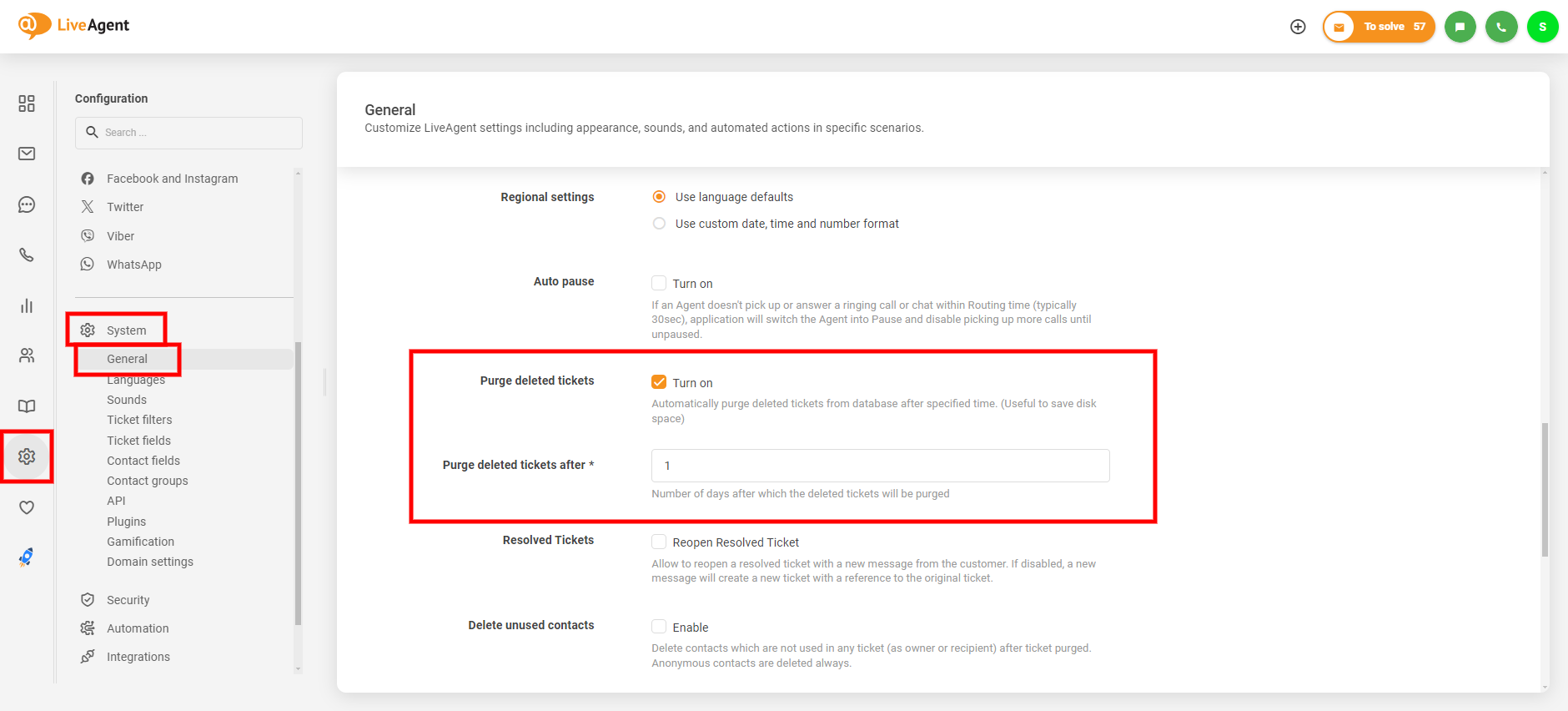 手動での完全消去に加え、削除済みチケットの自動完全消去を設定することもできます。これは「Configuration」(設定)> 「System」(システム)> 「General」(一般)で「Purge deleted tickets」(削除済みチケットの完全消去)機能を有効にすることで行えます。これにより、指定した期間が経過した後にチケットが自動的に完全消去されます。