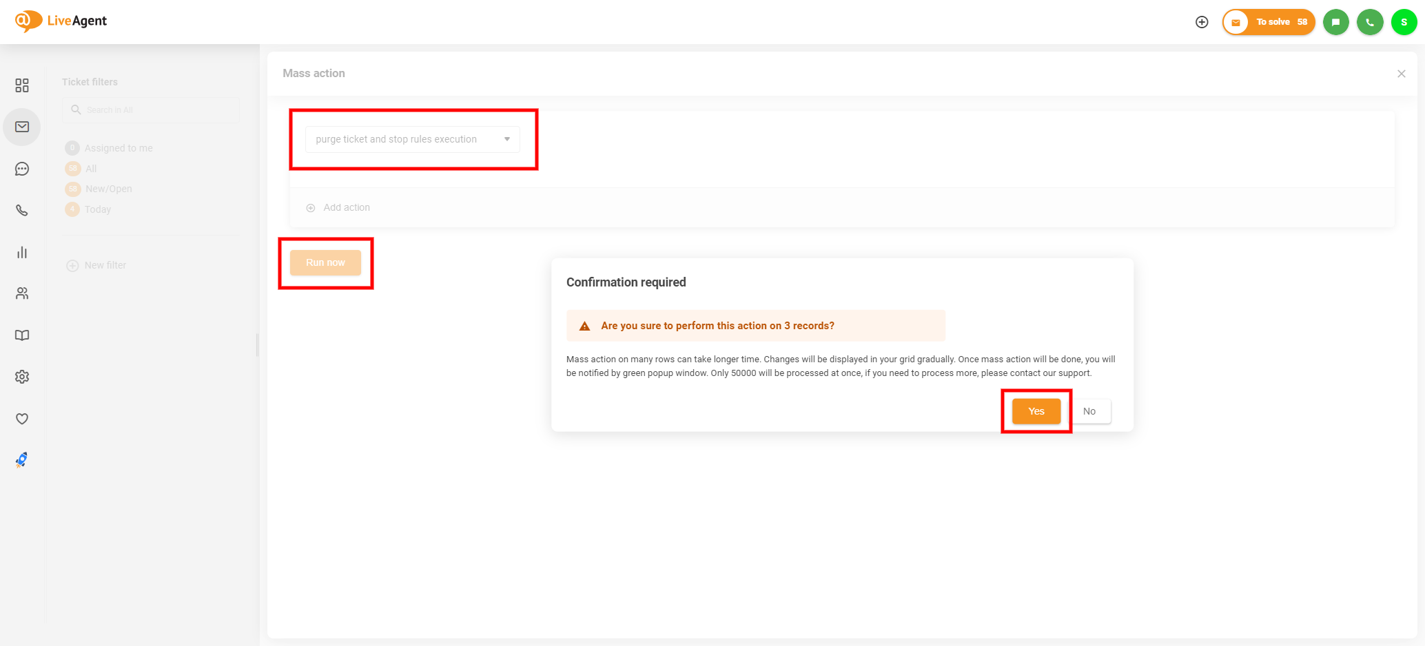 一括操作の選択画面で、「purge ticket and stop rules execution」(チケットを完全消去してルールの実行を停止する)オプションを選択し、「Run now」(今すぐ実行)ボタンをクリックして一括操作を実行します。ポップアップウィンドウで一括操作を確認し、一括操作が正常に完了したという通知が届くまで待ちます。
