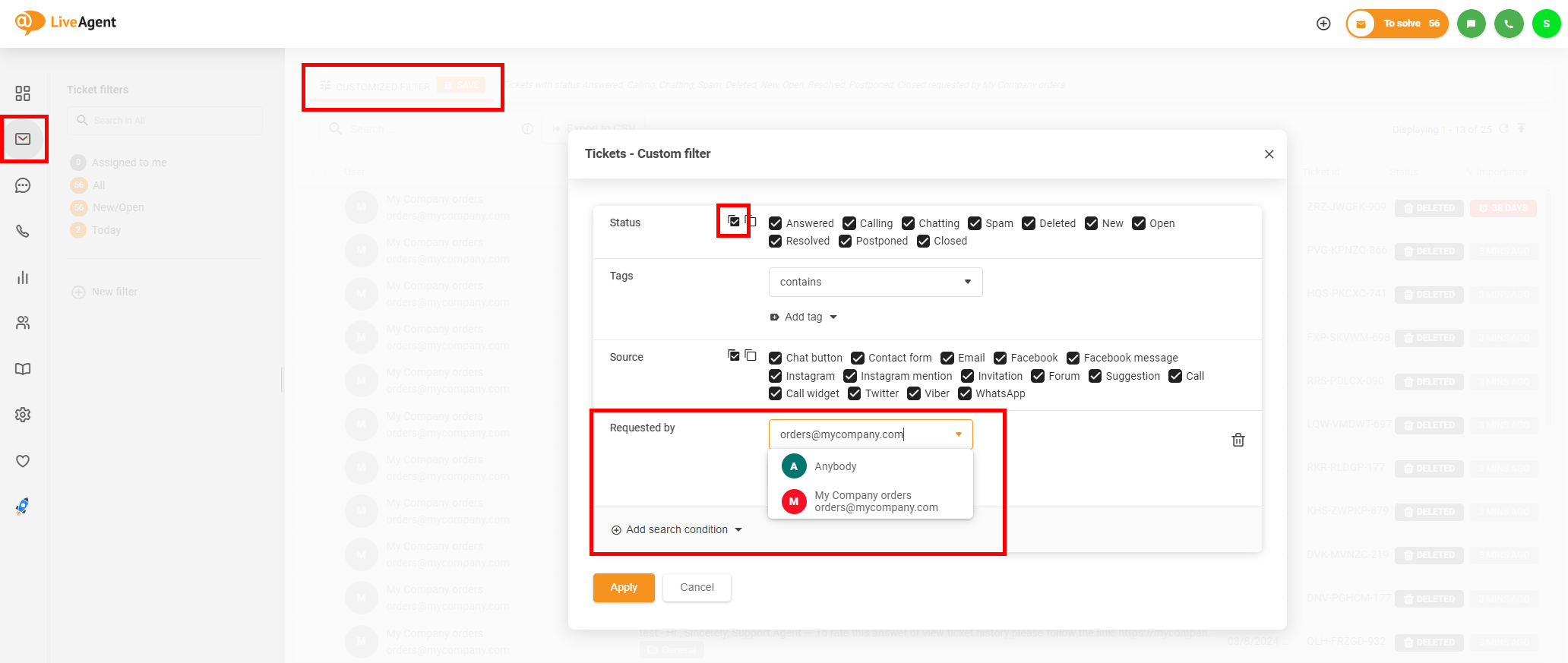 削除済みチケットを手動で完全消去するには、メニューの「Tickets」(チケット)セクションに移動し、カスタムフィルターを使用してすべてのステータスで削除した顧客のチケットを表示し、フィルターを適用します。