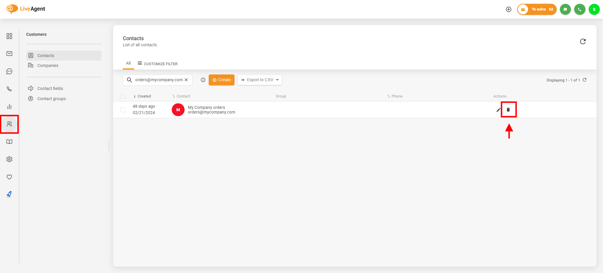 顧客を削除するには、エージェントパネルで「Customers」(顧客)> 「Contacts」(連絡先)に移動し、削除したい顧客を検索して「Delete」(削除)ボタンをクリックします。