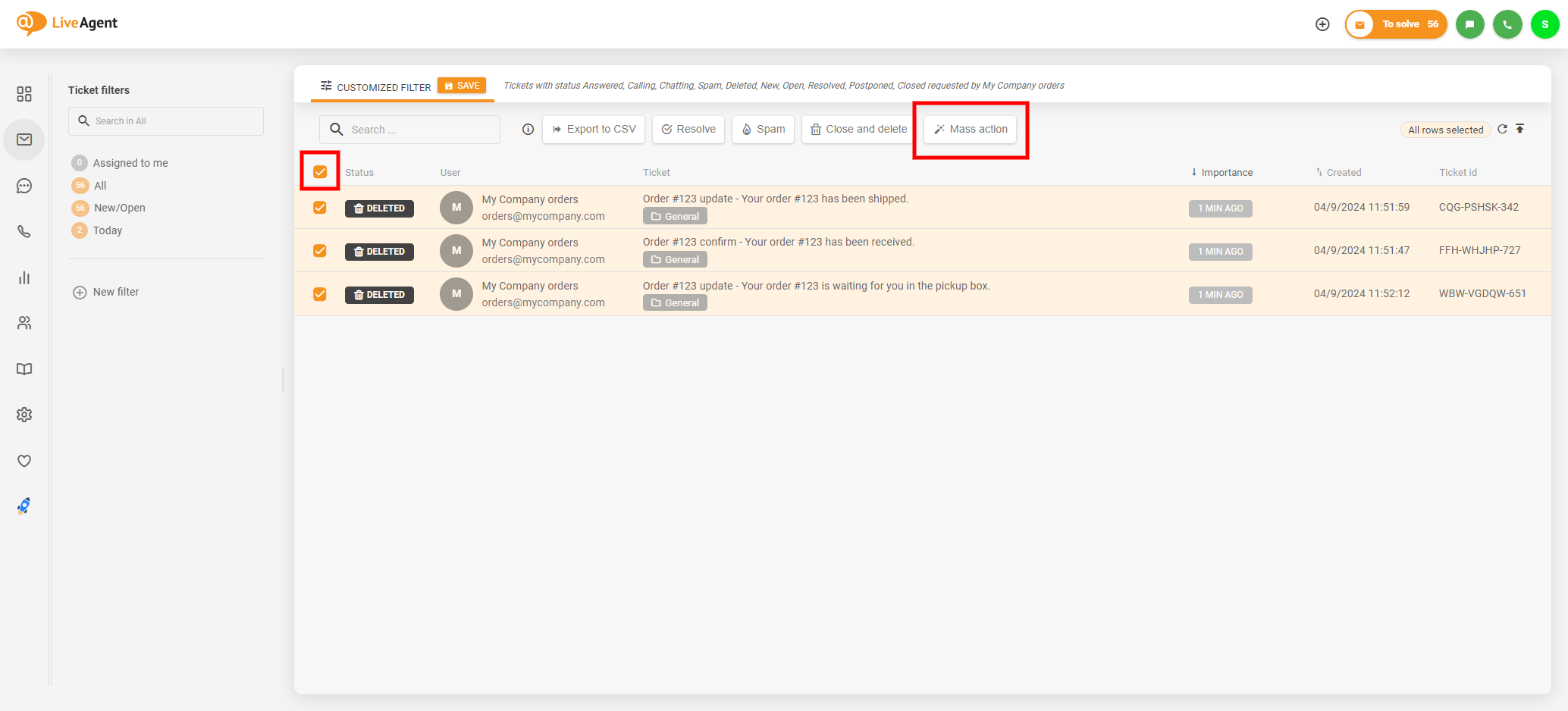削除済みチケットが表示されたら、すべて選択してチケットリスト上部の「Mass action」(一括操作)ボタンをクリックします。