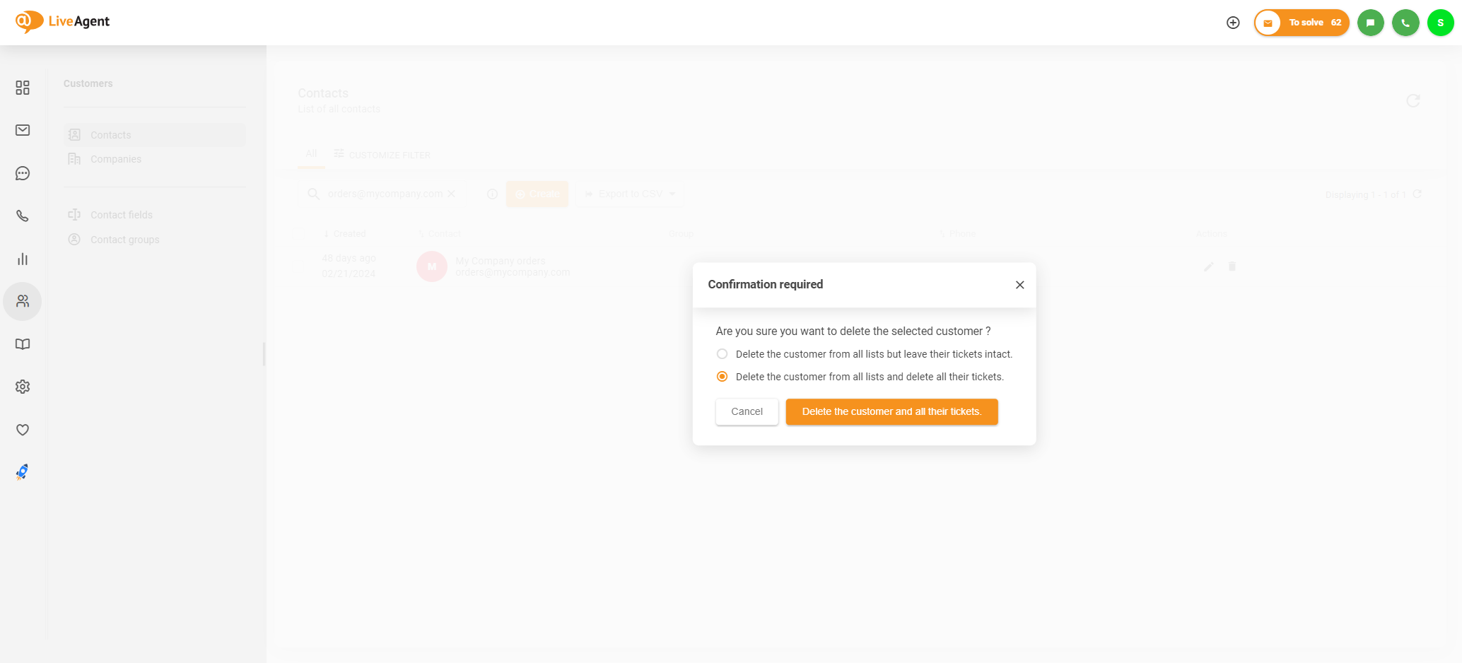 - Delete the customer from all lists but leave his tickets intact(すべてのリストから顧客を削除するが、チケットはそのまま残す) - このオプションは顧客を「Contacts」(連絡先)リストから削除しますが、その顧客が所有者であるすべてのチケットはシステムに残ります。