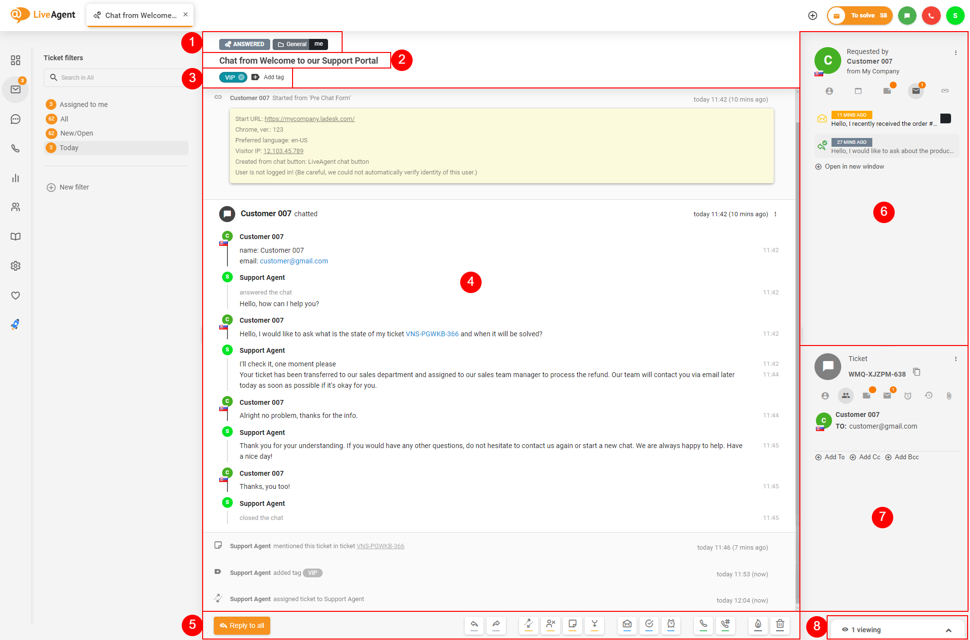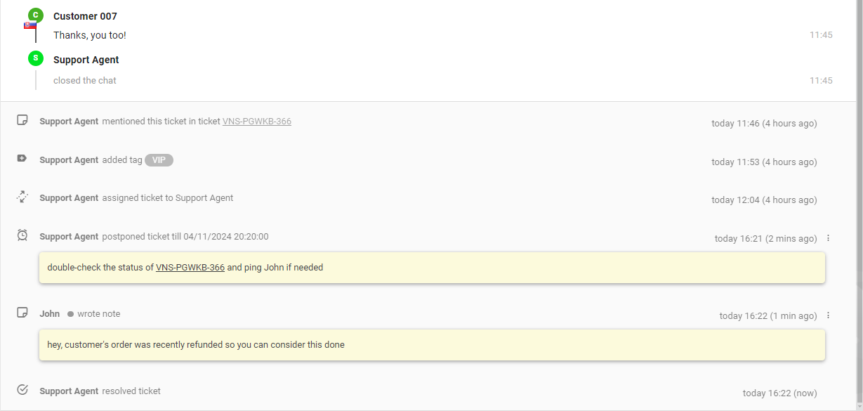 このセクションにはチケットのコンテンツが表示されます。顧客、エージェント、またはシステムからのすべてのメッセージ(ノートを含む)がここに集約されます。