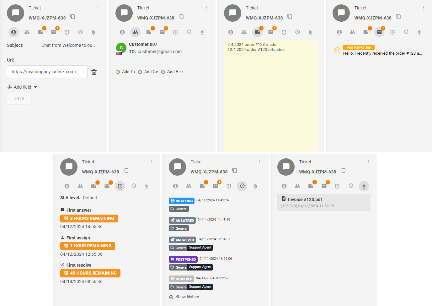 - Ticket history(チケット履歴) - チケットが経てきたすべてのステータスの履歴が記録されます。ステータス変更だけでなく、転送や割り当てのアクションも記録されます。