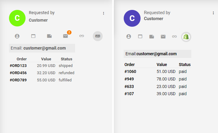 WooCommerce Orders、MailChimp Integration、Shopify Integrationなど、顧客情報を補完する追加プラグインを導入すると、「連絡先詳細」セクションにタブが追加されます。