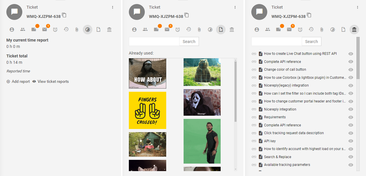 Time tracking、Giphy Integration、Ticket KB Suggestionsなど、チケット操作を強化する追加プラグインを導入すると、「チケット詳細」セクションにタブが追加されます。