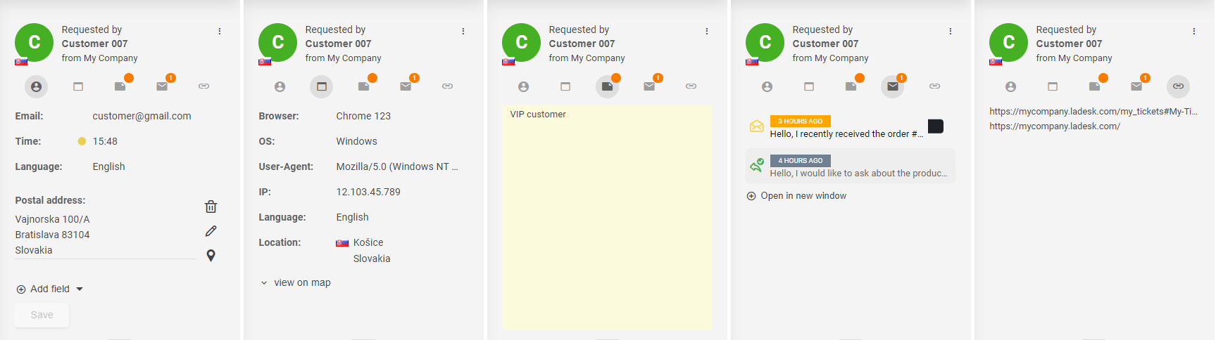 - Browser(ブラウザ) - 顧客がウィジェット経由でお問い合わせした場合に、ブラウザ、OS、IPアドレスと位置情報(IPアドレスをもとに特定)などの技術的な情報が保存されます(IPアドレスはメールからは取得できません)。